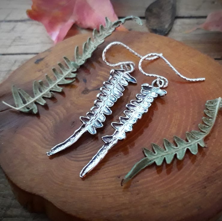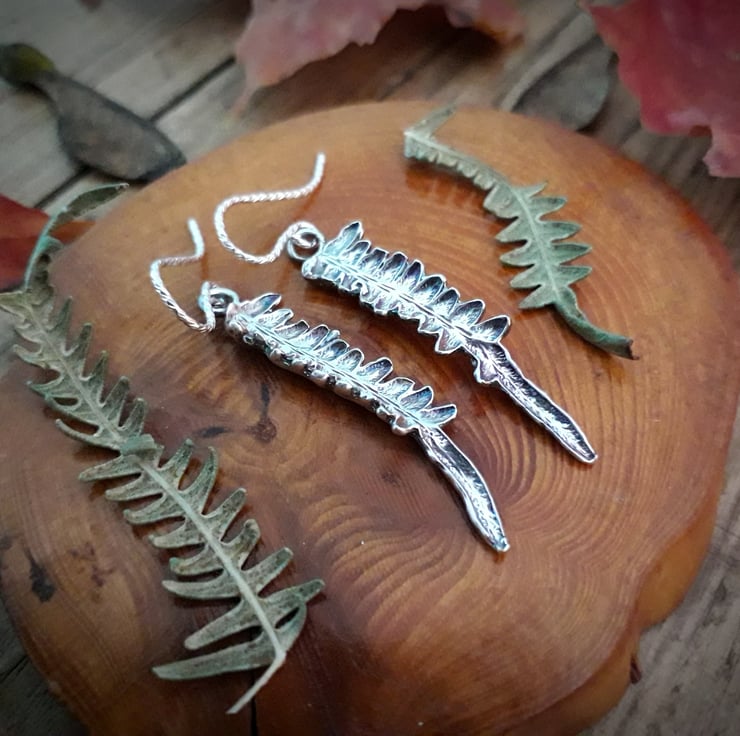 I brought these beautiful, very organic looking fern leaves back from a trip to Kielder forest last autumn. After carefully drying them, I applied thin layers of fine silver to preserve the texture and not damage the leaf. Once fired the leaves burned away and revealed shiny curled silver fern charms. A truly unique, one of a kind pair of earrings.
