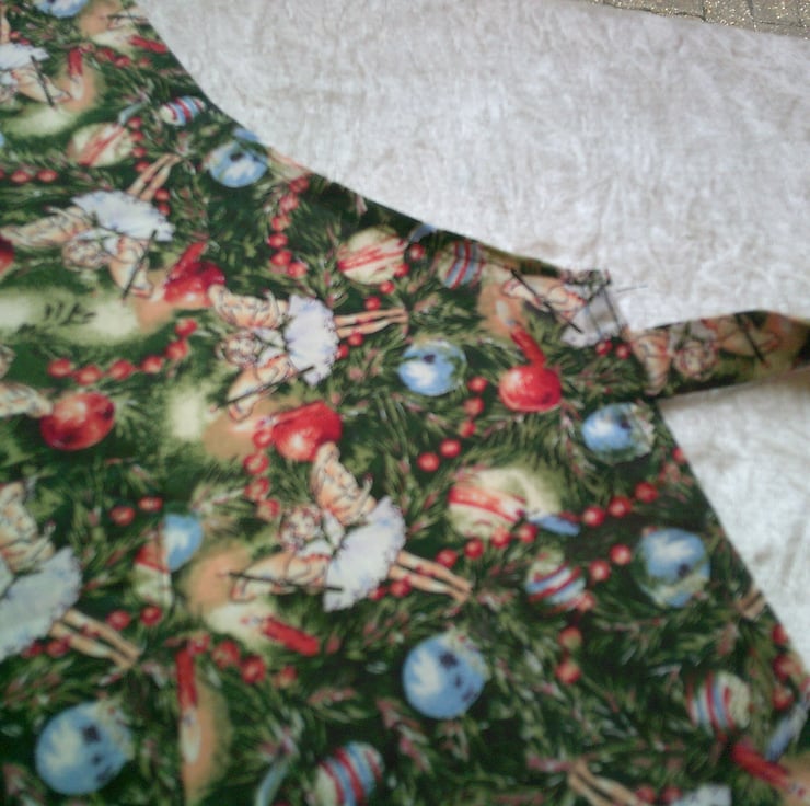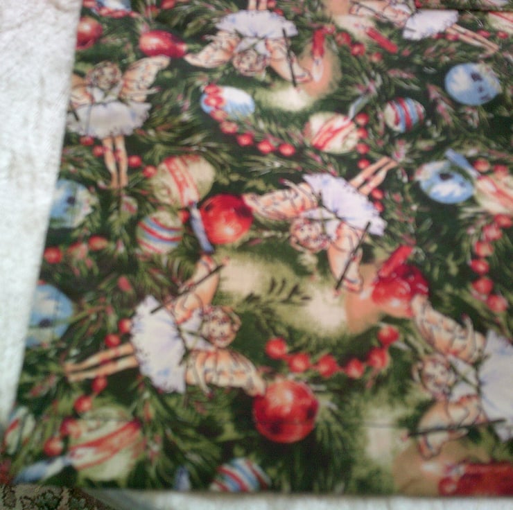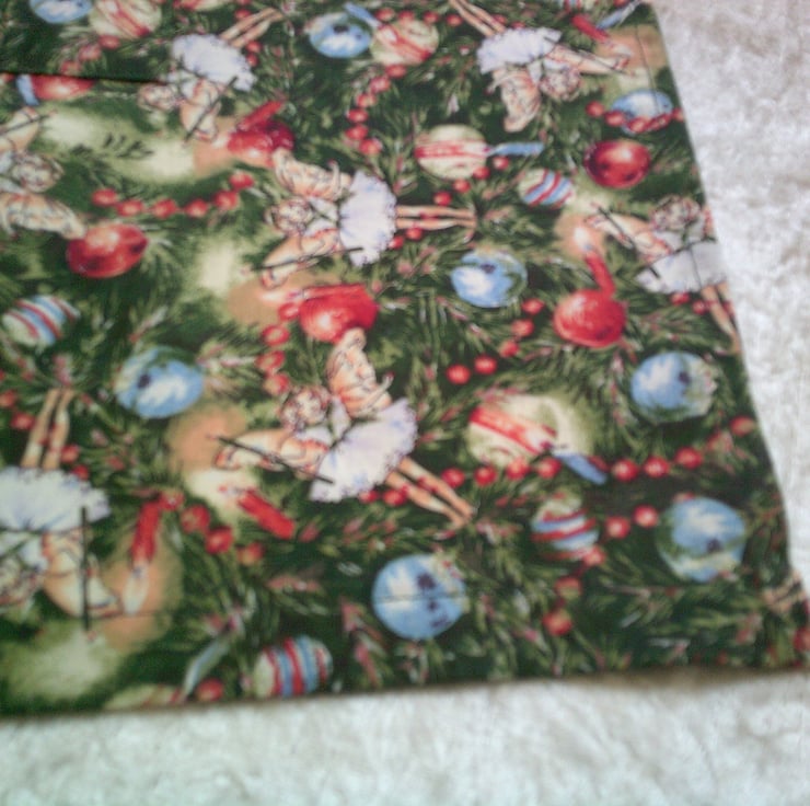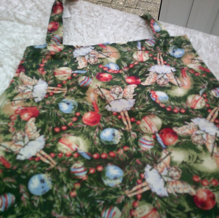 The design on this apron is of Fairies and Garlands on a background of a Christmas Tree.