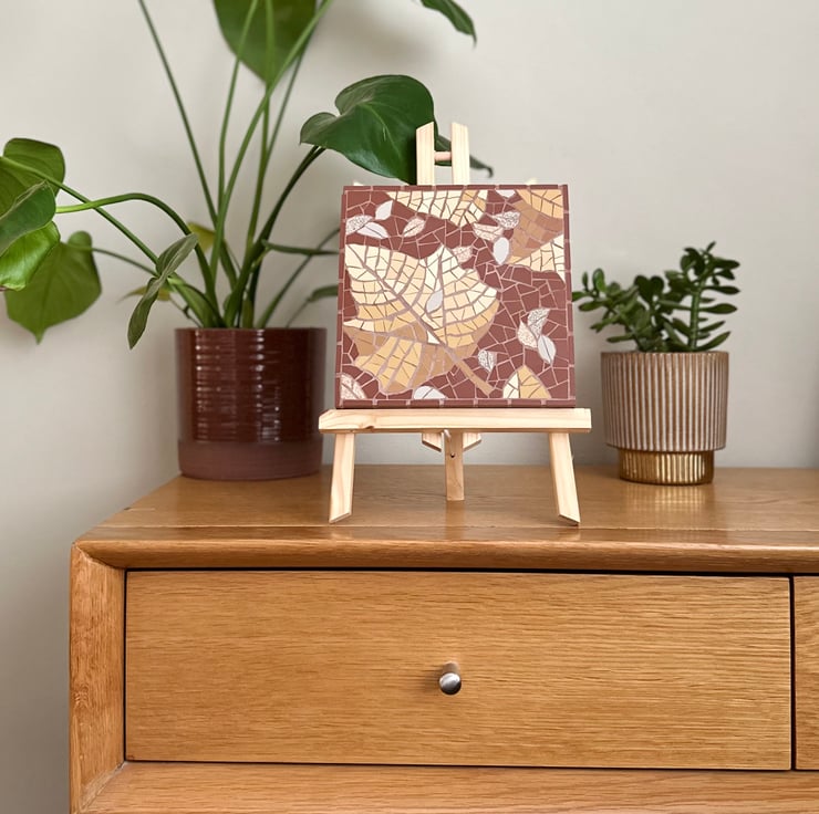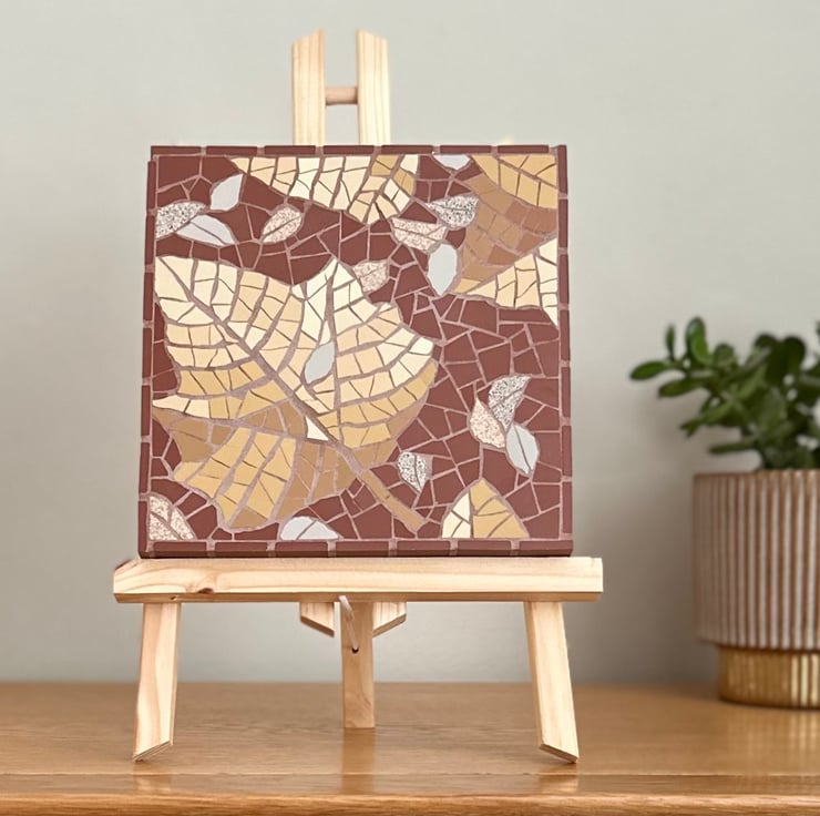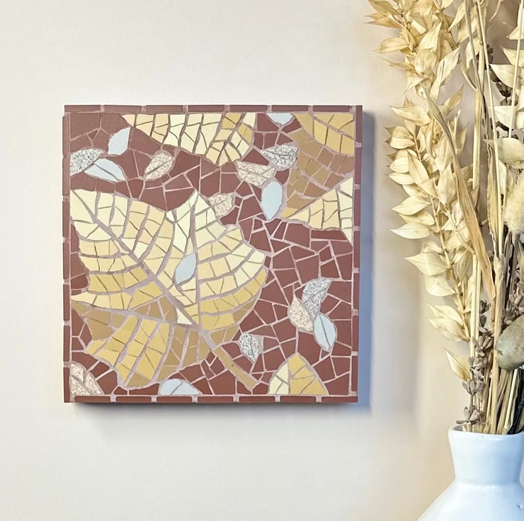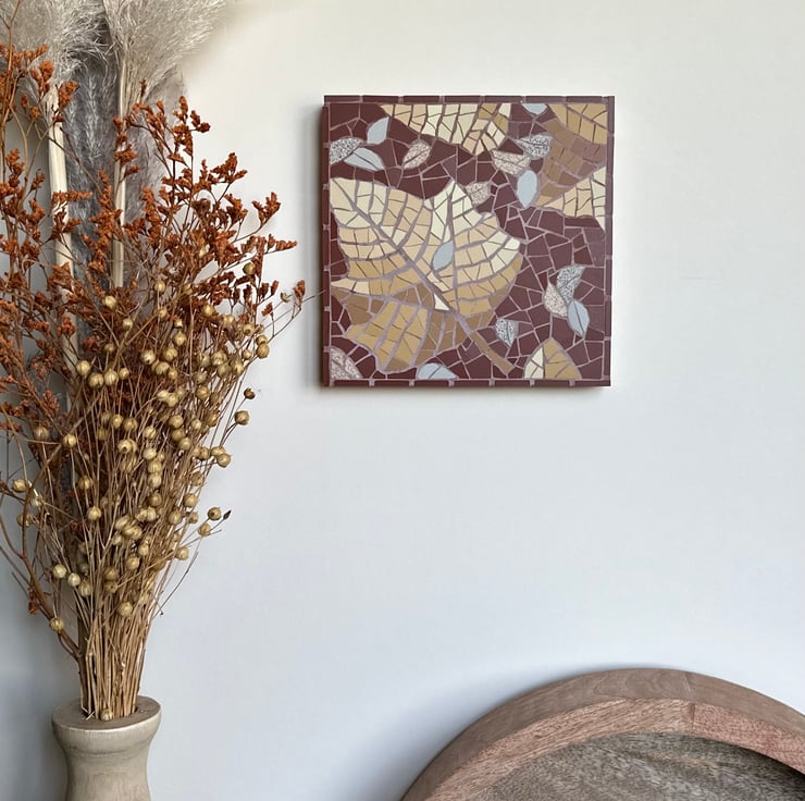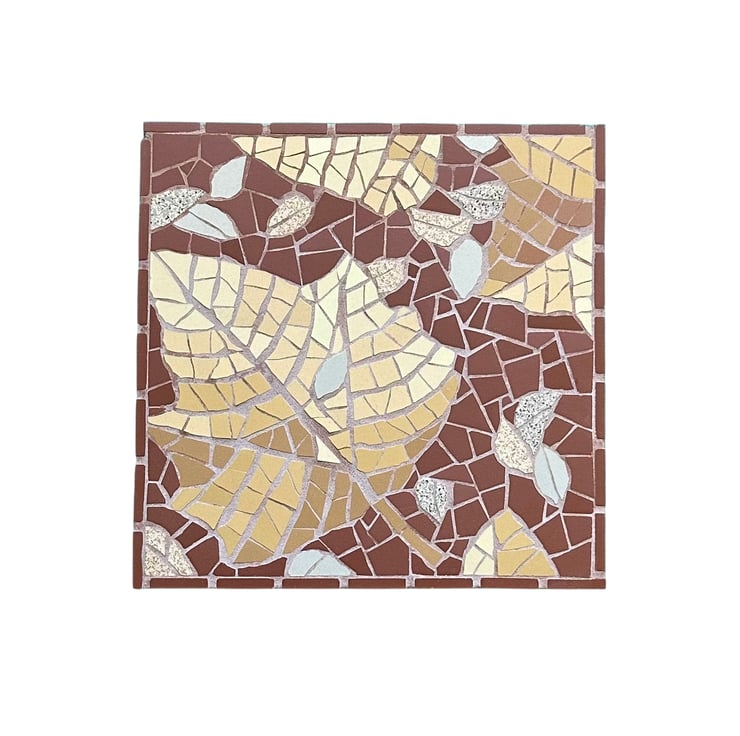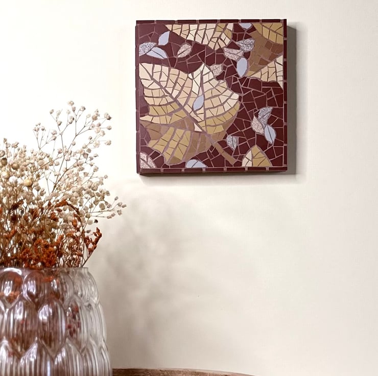 This original botanical art is created in mosaic and features golden autumn leaves on a brick red background. This design is inspired by leaves from a London Plain Tree and I have emulated the tiny veins with irregular rectangular pieces.