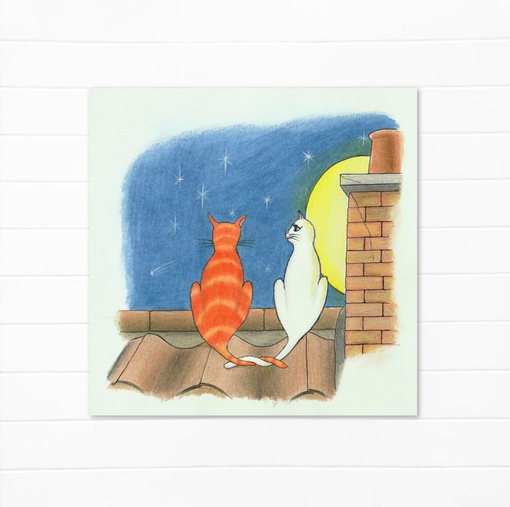 An original art card featuring a hand drawn pencil illustration of two loving cats sitting on a rooftop at night. An ideal card for any cat lover, it would make a great anniversary or valentine's day card.