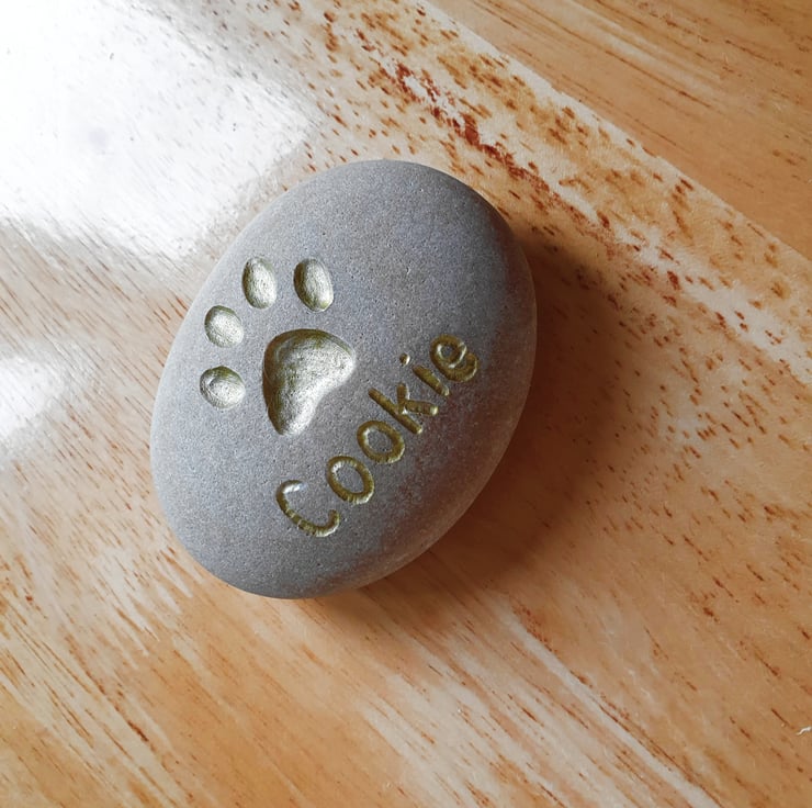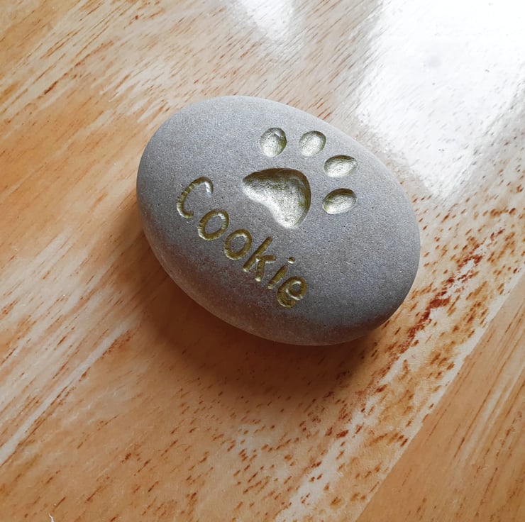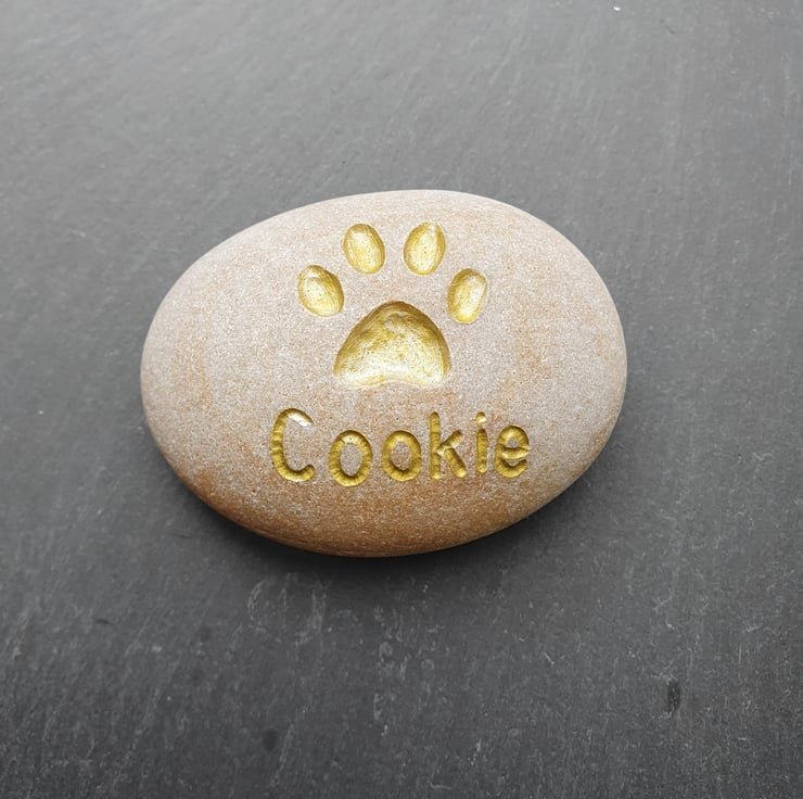 A grey, biege, sandy or light rose coloured stone, deeply engraved with a pets paw and then the pets name of your choice. A gold metallic colour is then applied in to the paw and the letters of the name, see photos. This gives a lovely contrast to the stone surface and highlights the name and paw. You can also have your pets name engraved on the front of this stone and I'd recommend it being just underneath the paw print, as shown. This thoughtful gift could be used as a grave marker, paper weight, book end or an ornament for a desk, window cill or mantelpiece and given for a birthday, wedding anniversary, engagement gift, Christmas present, Mother's day or placed in a garden to remind you.