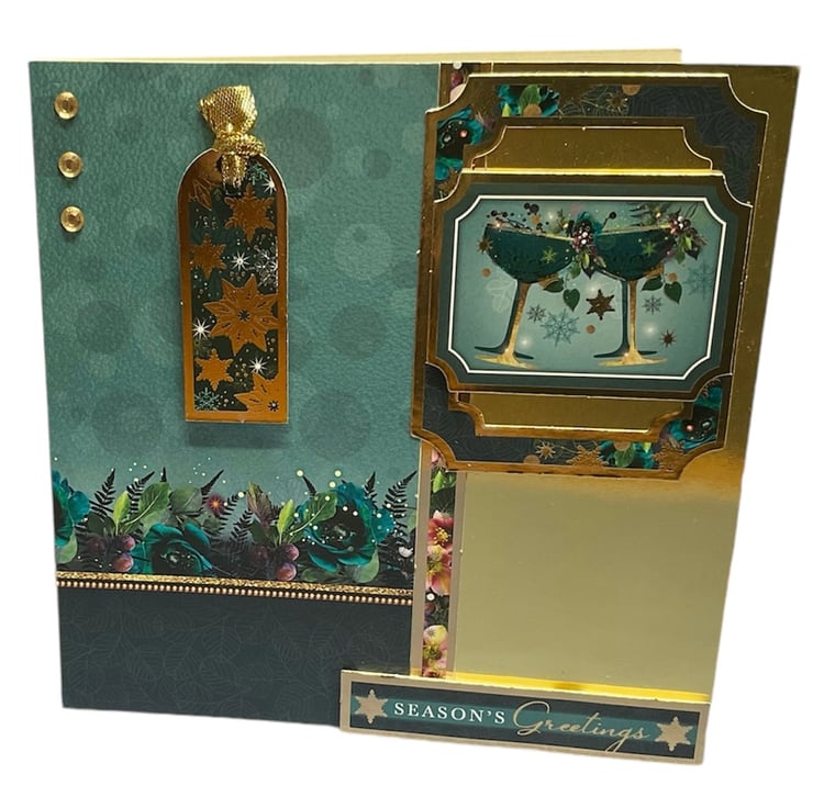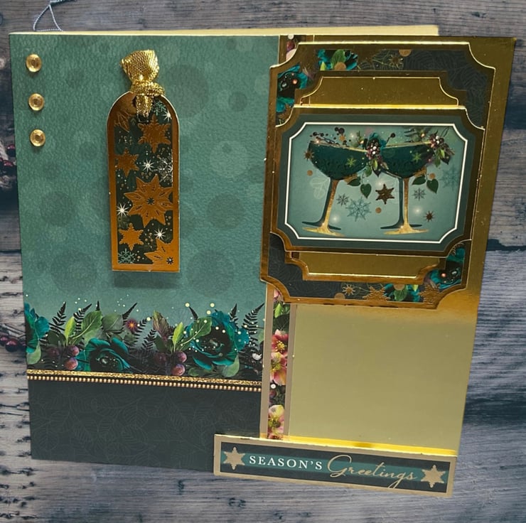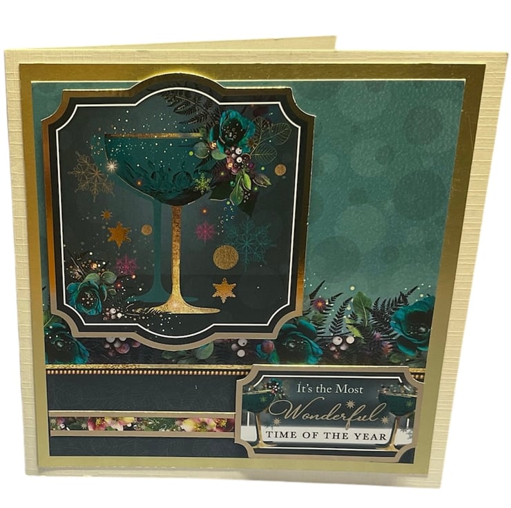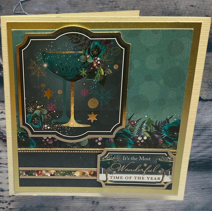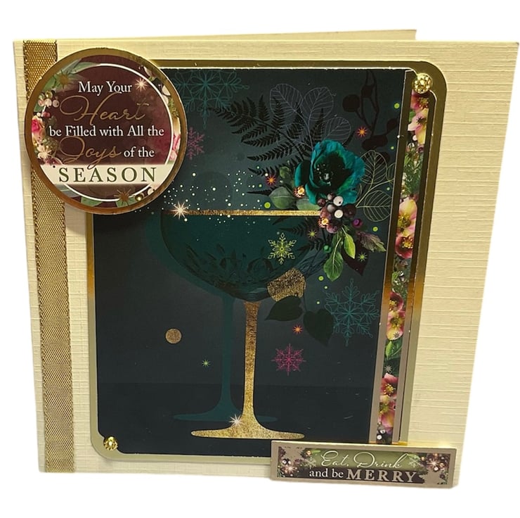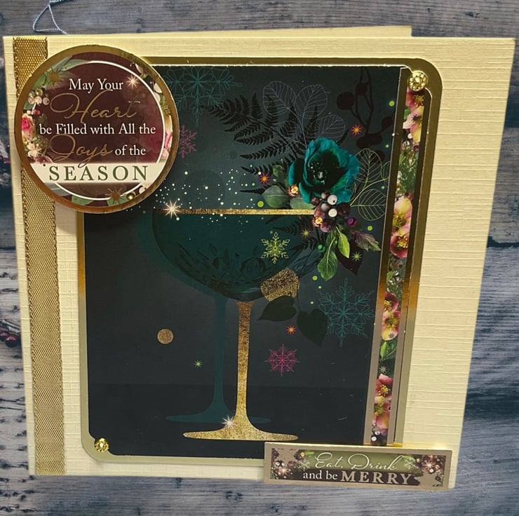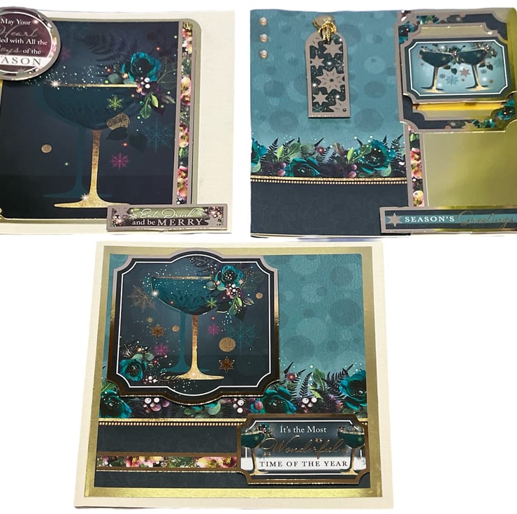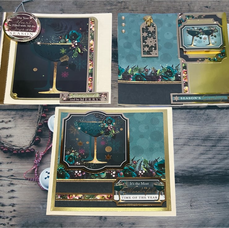 These lovely cards have been layered with gold mirror card, luxury card in dark blue and greens layered with toppers in various designs. Each card is unique and has a different greeting added in 3D, Seasons Greetings, It’s the Most Wonderful Time of the Year, May Your Heart be Filled With the Joys of the Season and, Eat, Drink and be Merry