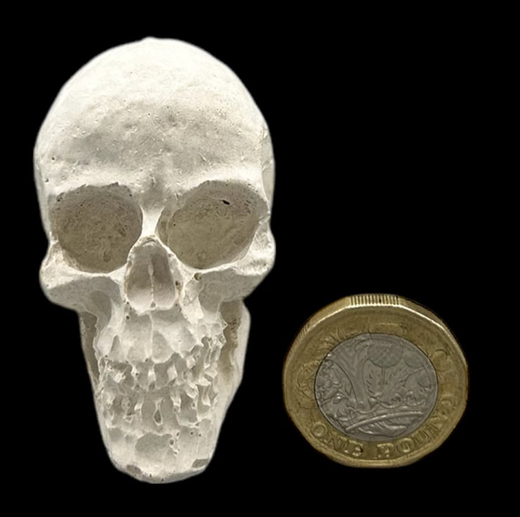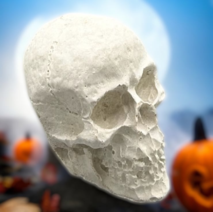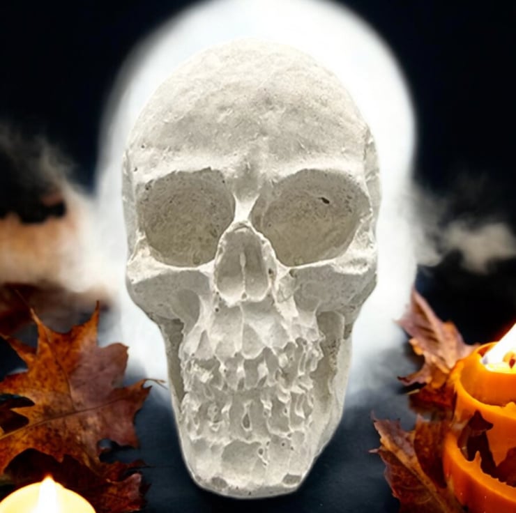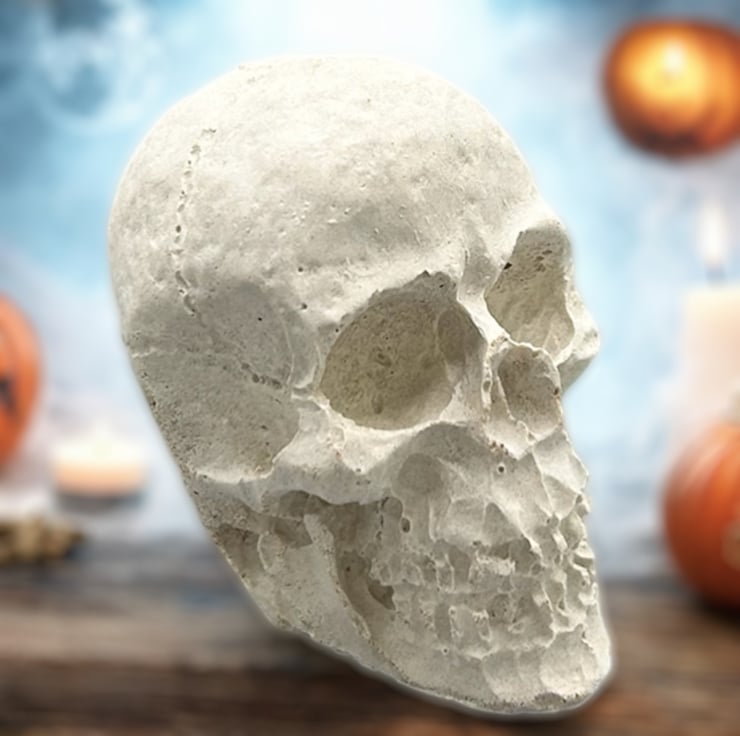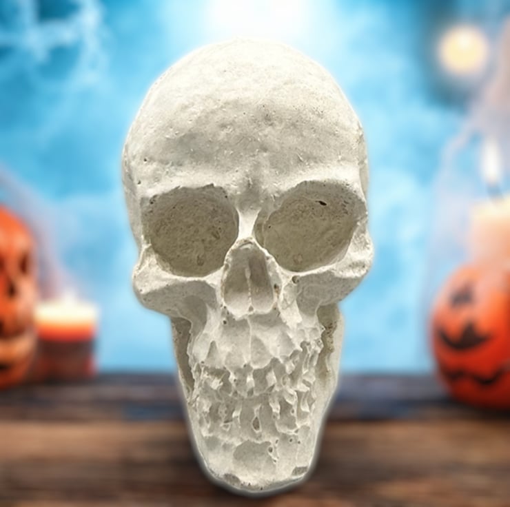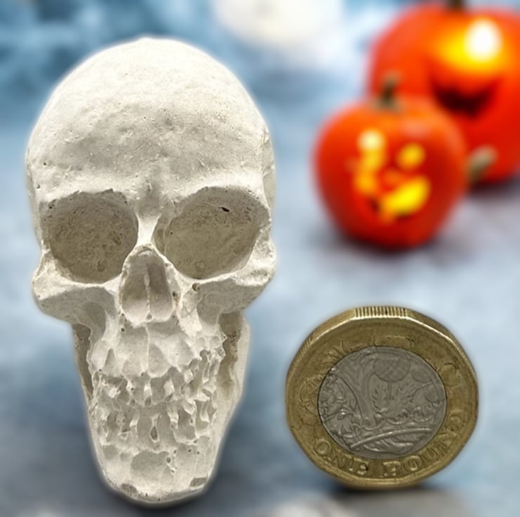 This mini Halloween Skull decoration is handcrafted from premium white cement and silver sand giving it a light grey colour. This eerie piece is left unsealed, allowing you to paint it to match your spooky aesthetic if you so desire, but it looks great as it is. This tiny skull ornament will add a touch of the macabre to your Halloween decorations this year.