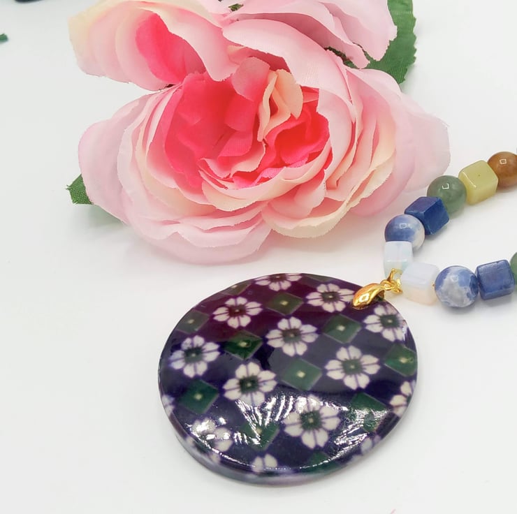 This gorgeous floral mother of pearl pendant would look great with any outfit that you wear for everyday wear or for an evening out. It would make the lovely gift for a jewellery loving lady for a birthday or anniversary or a lovely treat for yourself. This necklace has a very pretty shell pendant with a purple floral pattern. The pendant is 50 mm in diameter. It is suspended on a beaded necklace made with 8 mm mixed gemstone round beads and 6 mm x 6 mm mixed gemstone cube beads. The gemstones include sodalite, agate, jade, goldstone and lapis lazuli. The necklace is fastened by a gold plated lobster clasp and the bail is also gold plated. The overall length of the necklace is 17 inches (43 cm) and the pendant has a 2.5 inch (6 cm) drop from the base of the bail. The necklace will be dispatched wrapped in tissue paper in an organza bag and be delivered to you via Royal Mail first class post.