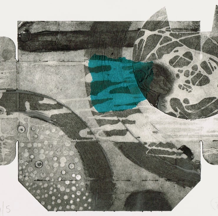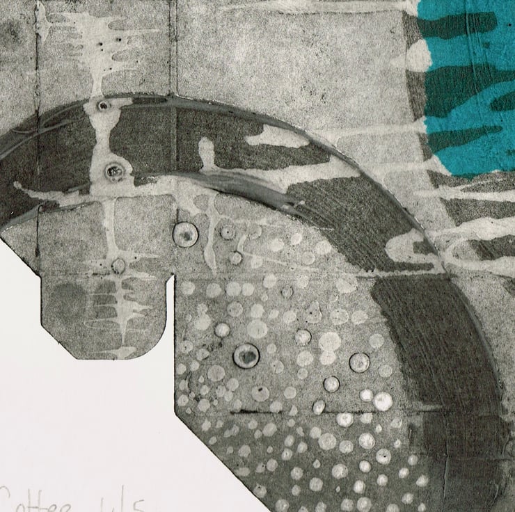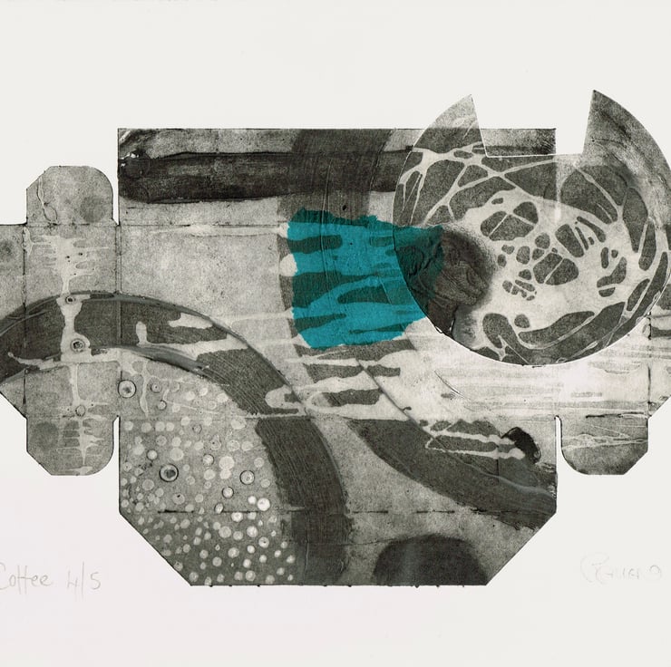 This is a collagraph print made with with recycled materials. The print plate with made with old Tetra packaging and it is titled ' coffee' as it was an coffee box. Its is printed on cotton rag watercolour paper and is printed with Akua soya based inks. It has a little chine colle tissue decoration over the print. The print is 30.5cm x 23.5cm. it is a limited edition of 5 and this is number 4.