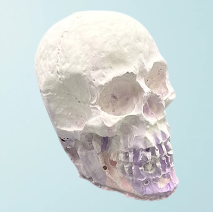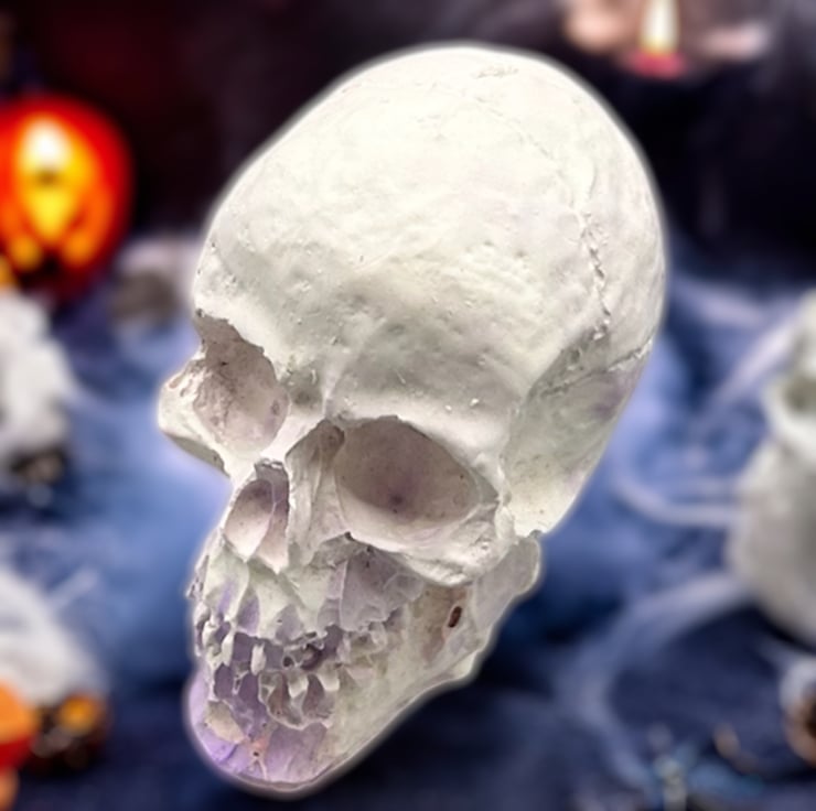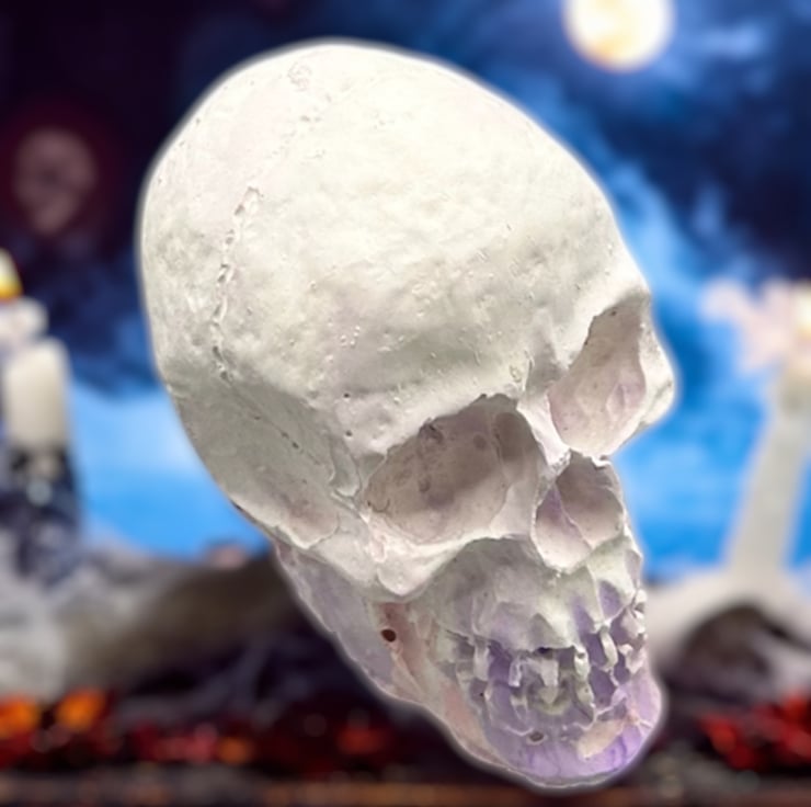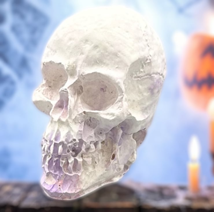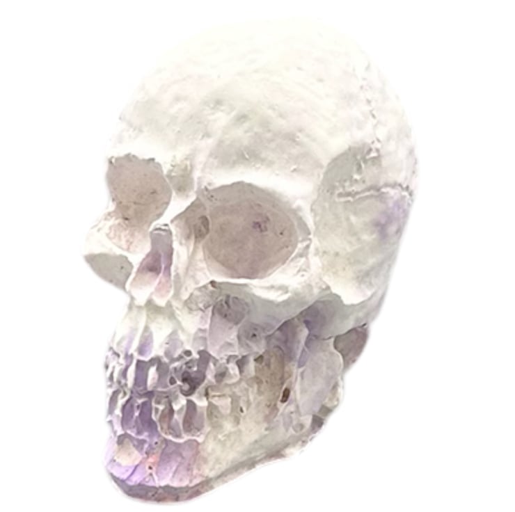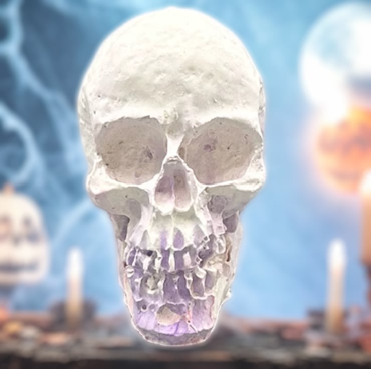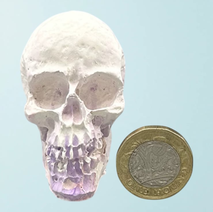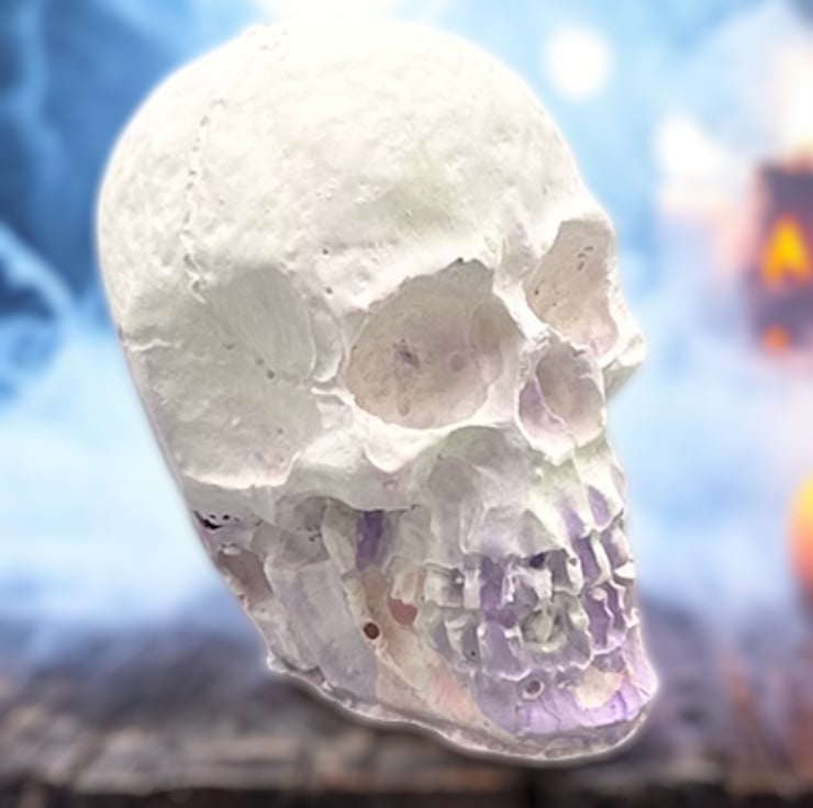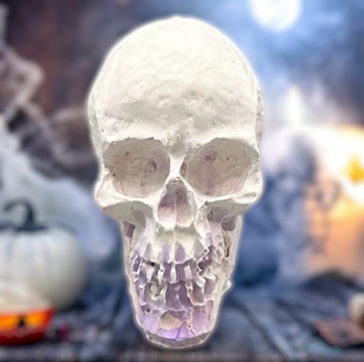 This mini purple, pink and white handmade Halloween skull decoration is crafted from Stonecast plaster. Stonecast is a premium alpha plaster with a hard surface and lovely smooth feel to it. This tiny skull ornament will add a touch of the macabre to your Halloween decorations this year.