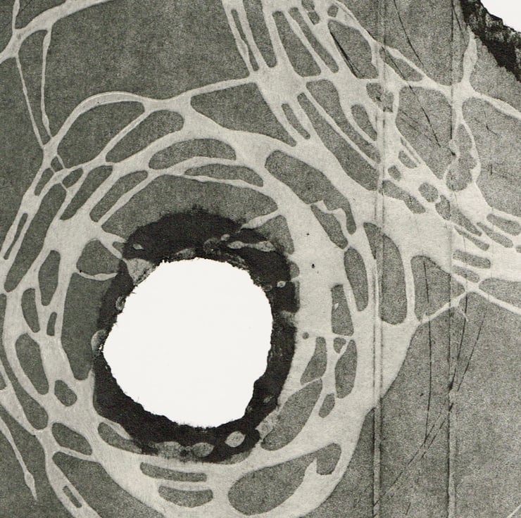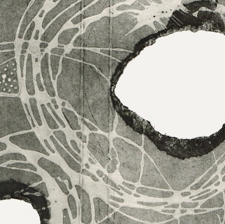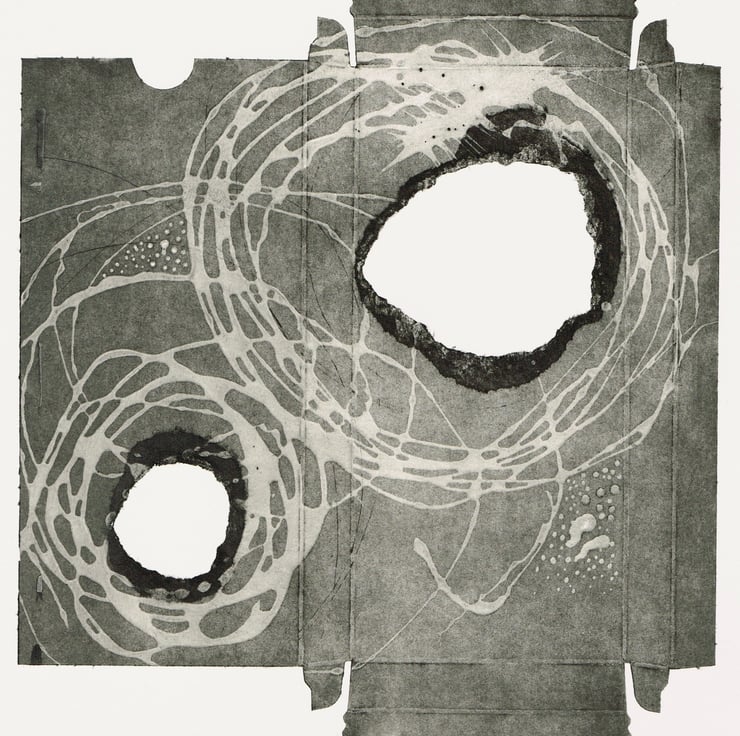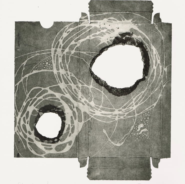 This is a collagraph print made with with recycled materials. The print plate with made with old Tetra packaging and it is titled ' chocolate ' as it was an chocolate packet. Its is printed on cotton rag watercolour paper and is printed with Akua soya based inks. The print is 35.5cm x 27cm. it is a limited edition of 6 and this is number 1.
