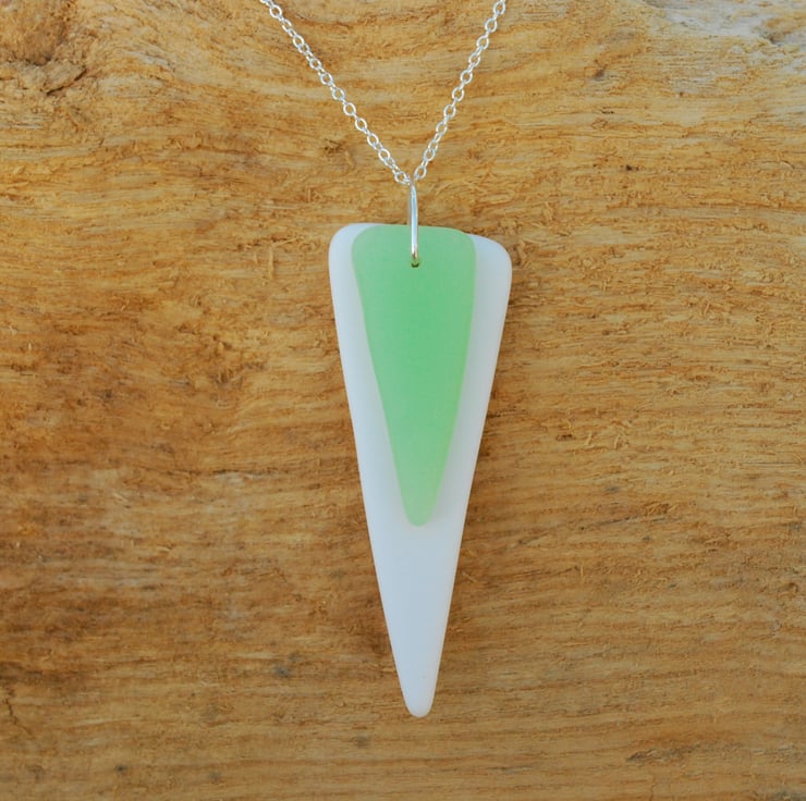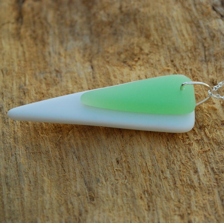 This amazing pendant has been made from two triangular pieces of tumbled milk glass. We found the pieces of glass on the beach and smoothed them so they are finely frosted. The shapes match beautifully to create an eyecatching pendant.