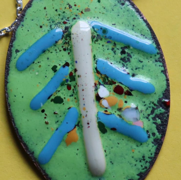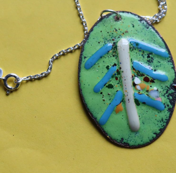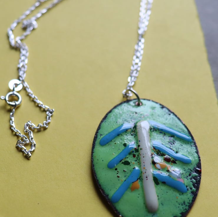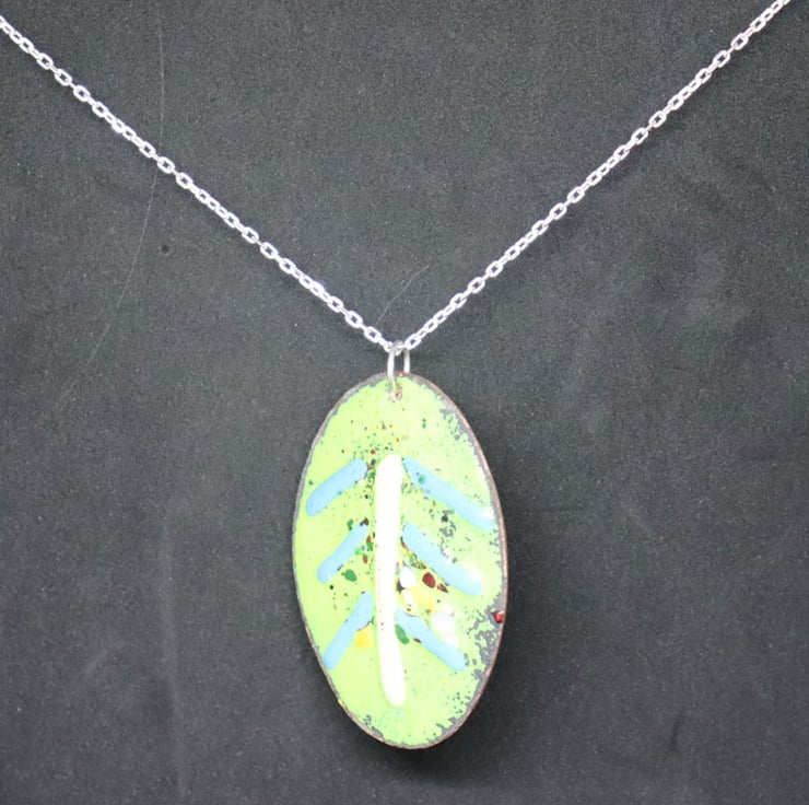Handcrafted from copper sheet, this pendant was hand-pierced into an oval shape and decorated with a base layer of light green enamel. Opaque enamel glass threads were then placed in an Native American pattern and a sprinkled of enamel frit applied. The pendant was counter-enamelled and fired in the kiln to fuse it to the base metal. It is suspended from a sterling silver chain. It measures 4cms x 3cms, the total length being 26cms.