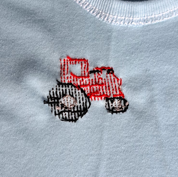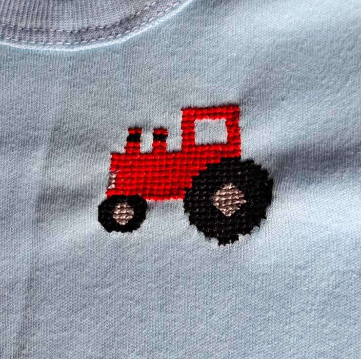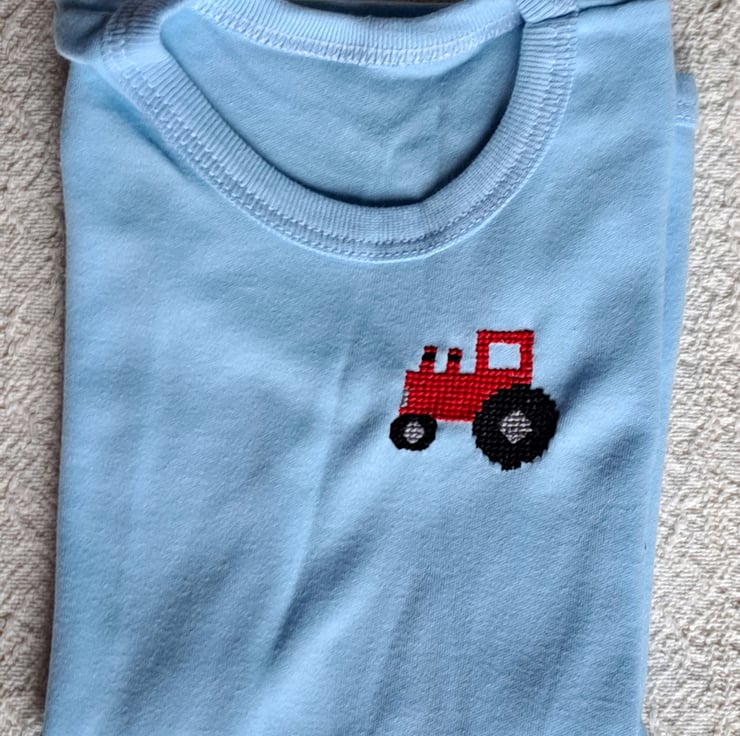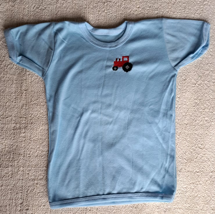 I have cross-stitched a red tractor on the left front of this lovely pale blue T-shirt. As I never use a permanent backing material when hand stitching kids' clothing, there is nothing inside to irritate your child's skin. The shirt has short sleeves, a ribbed band around the neck, sleeves and hem and will fit a child of around four to five years. It is all soft cotton and can be machine washed.