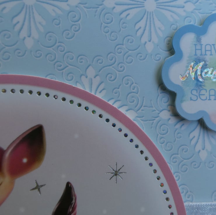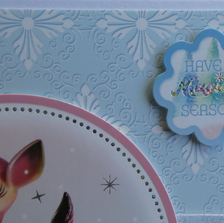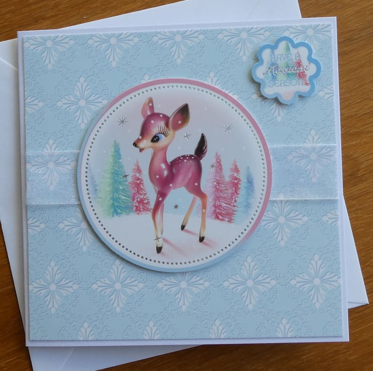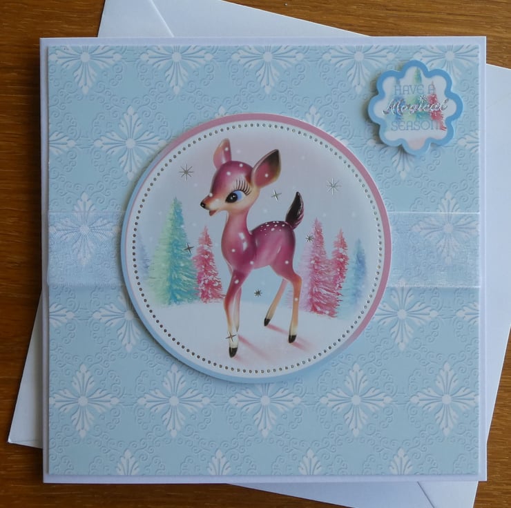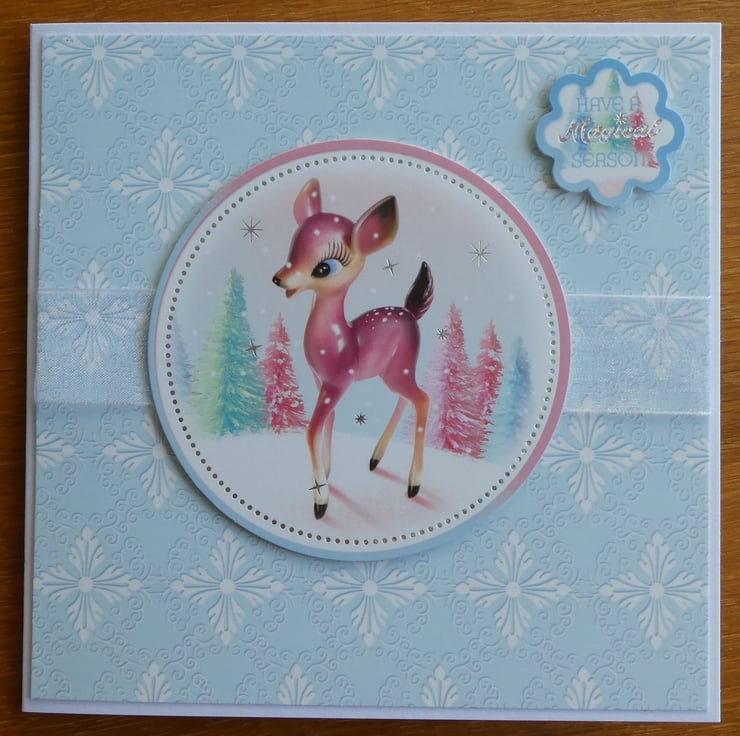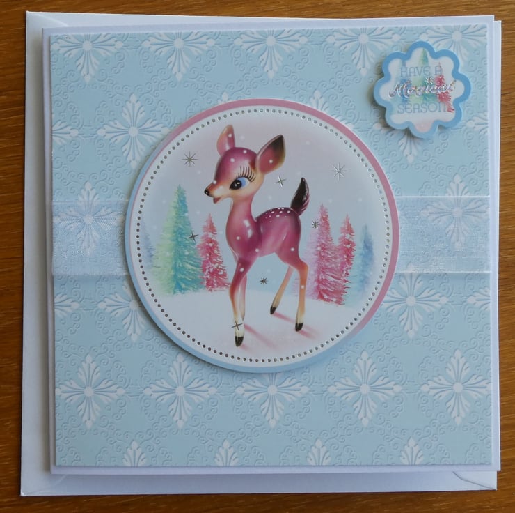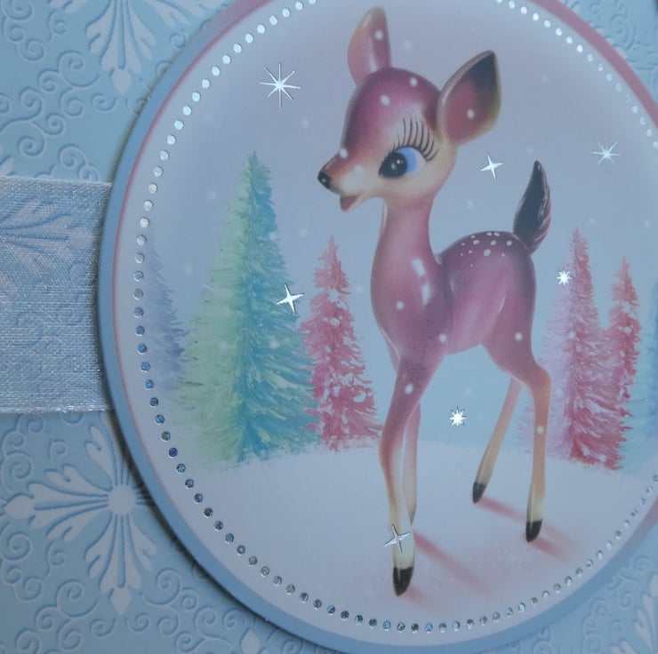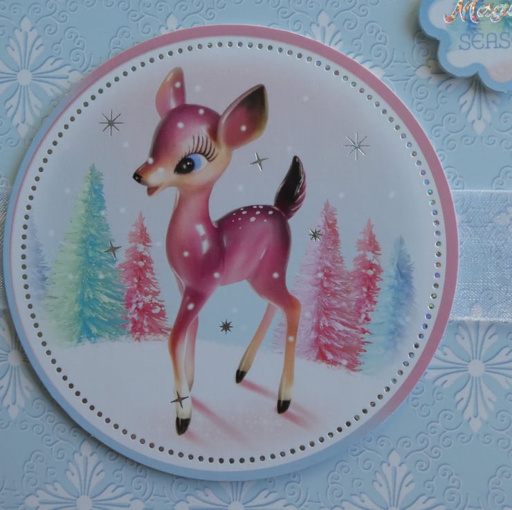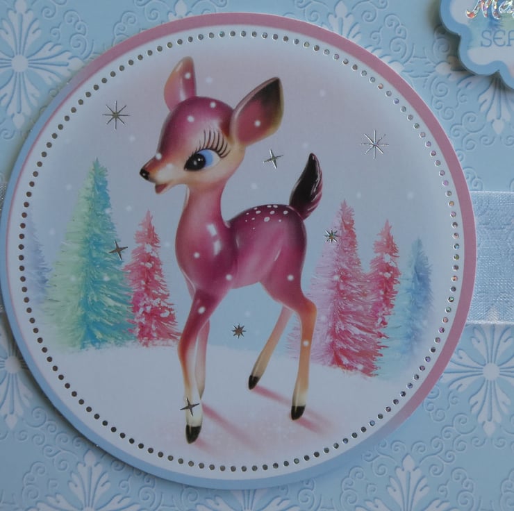 The front of the card has a circular topper showing a kitsch 50's style pink deer with long eyelashes against a background of pink, blue and green trees. This has been mounted on foam pads above a pale blue background card printed with a stylised white snowflake design and wrapped with a white organza ribbon.