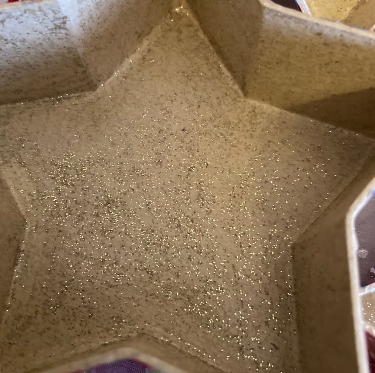 A shimmer of gold and red sparkle has been added on the outside with gold shimmer on the inside. They are 2 different sized boxes with these approx measurements