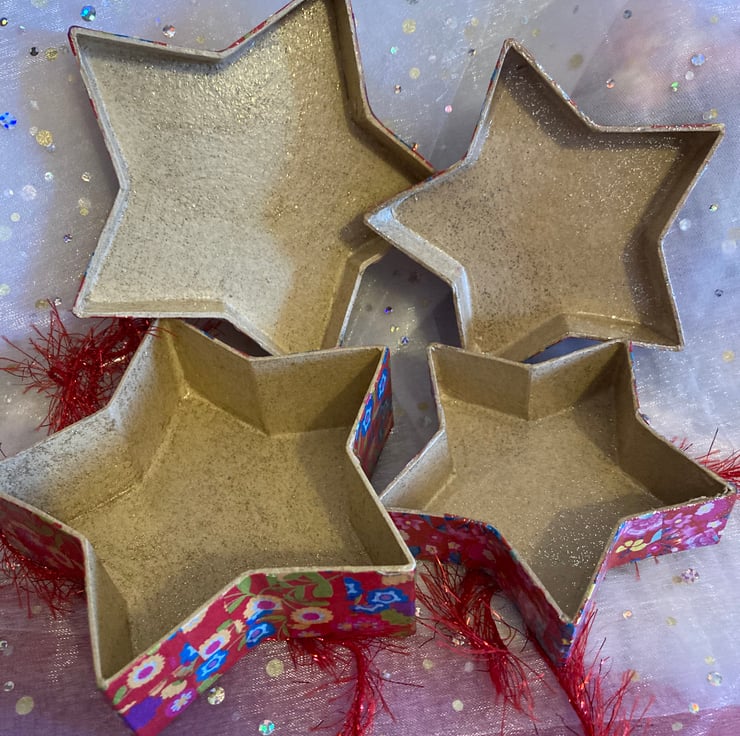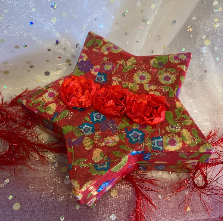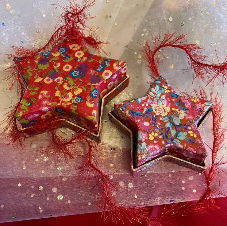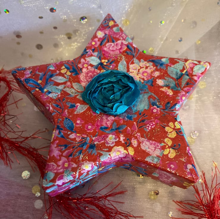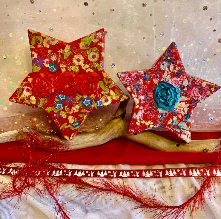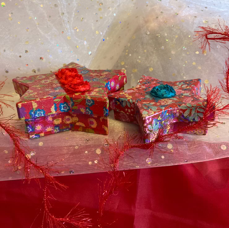These 2 starry gift boxes started off as plain paper mache boxes. They have been transformed by using different red floral papers and topped with pretty flowers of red and teal.