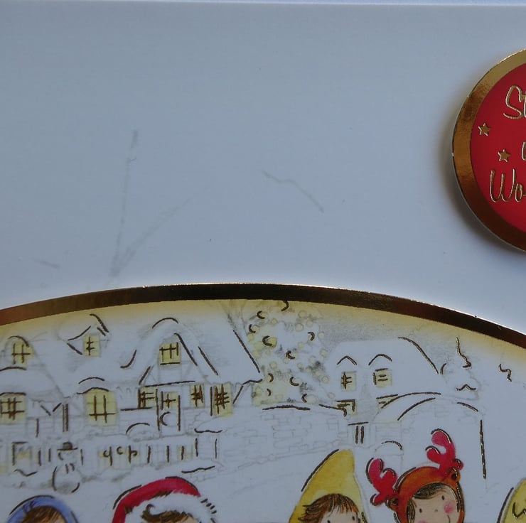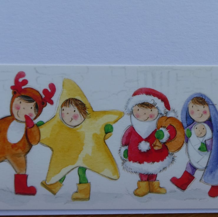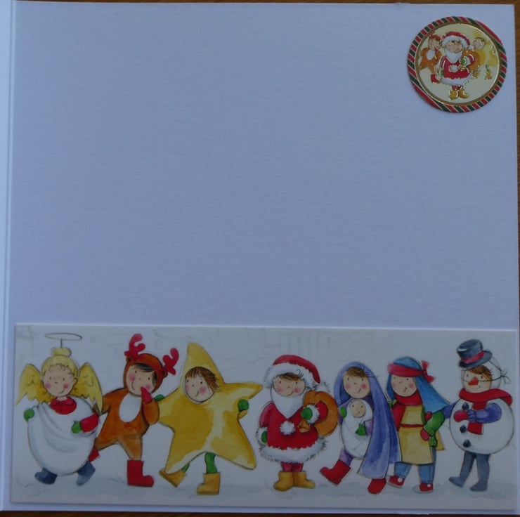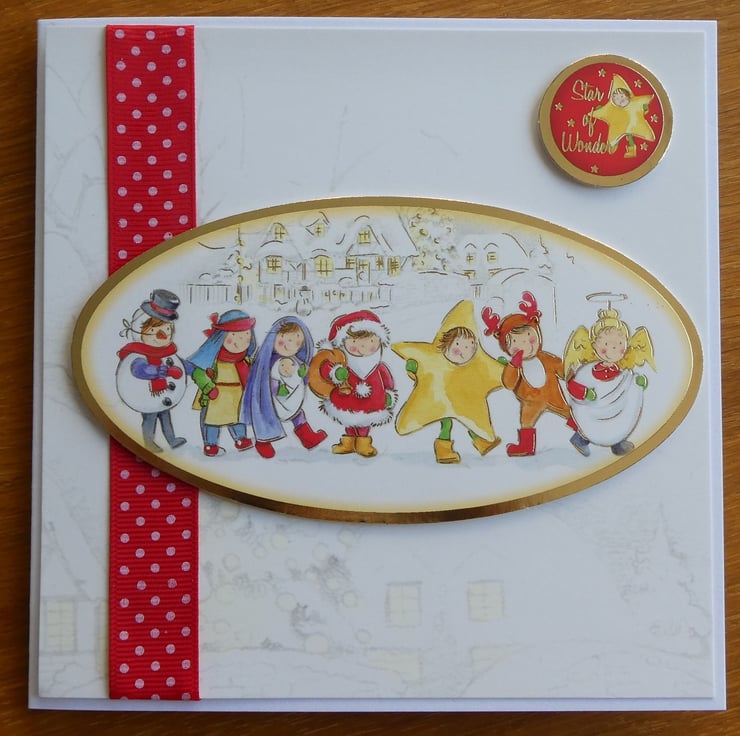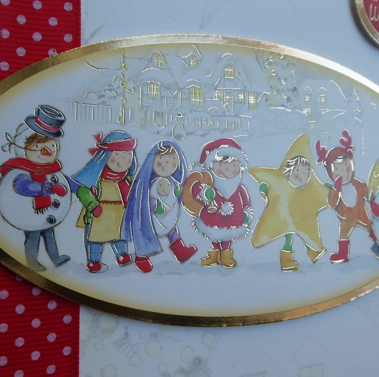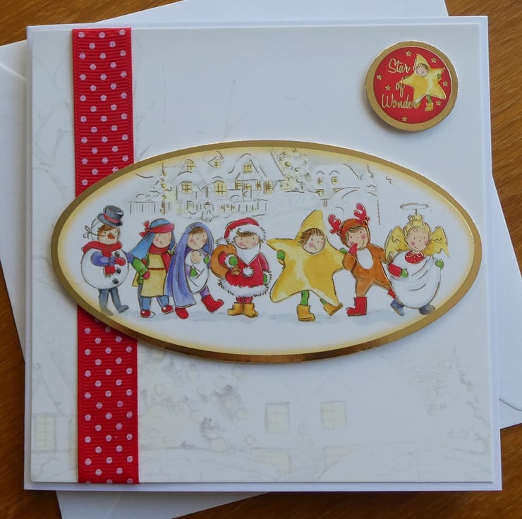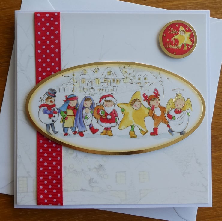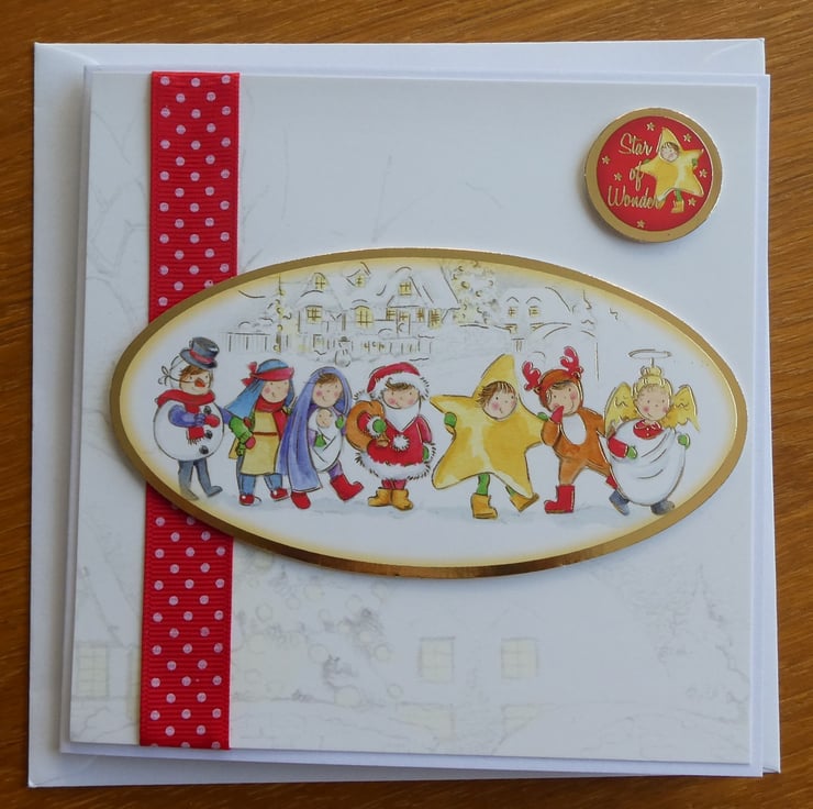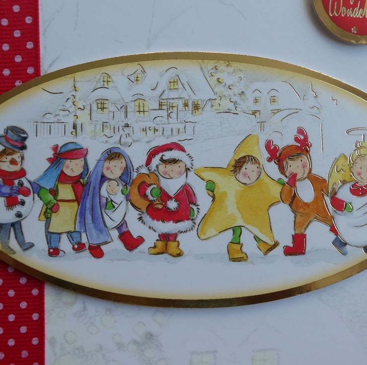 The front of the card has a central image printed onto quality gloss card showing children dressed up in Nativity costumes. The image has been mounted onto background card showing a muted street scene, wrapped with red and white polka dot ribbon.