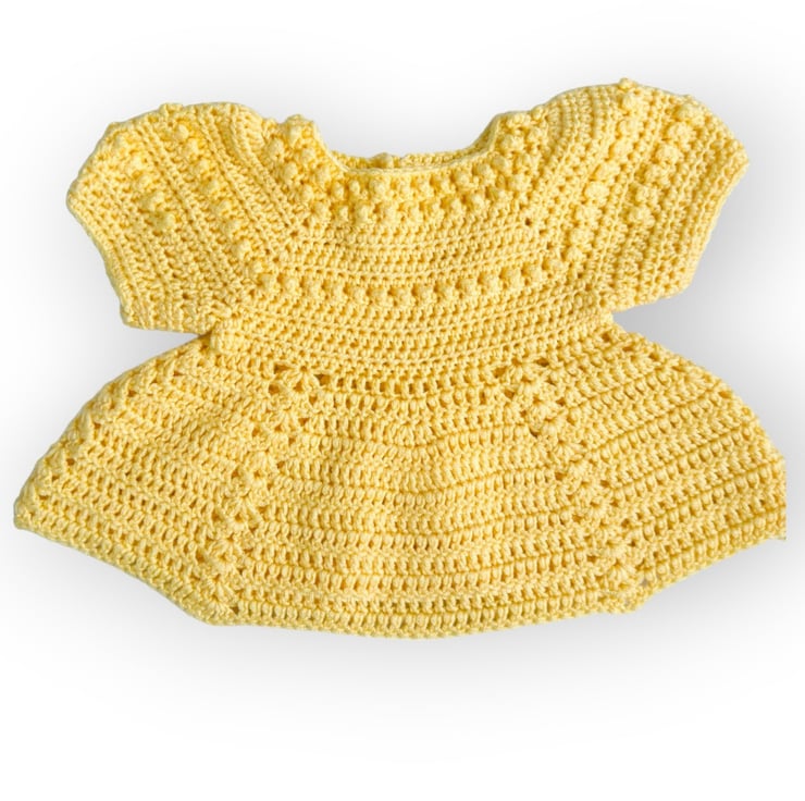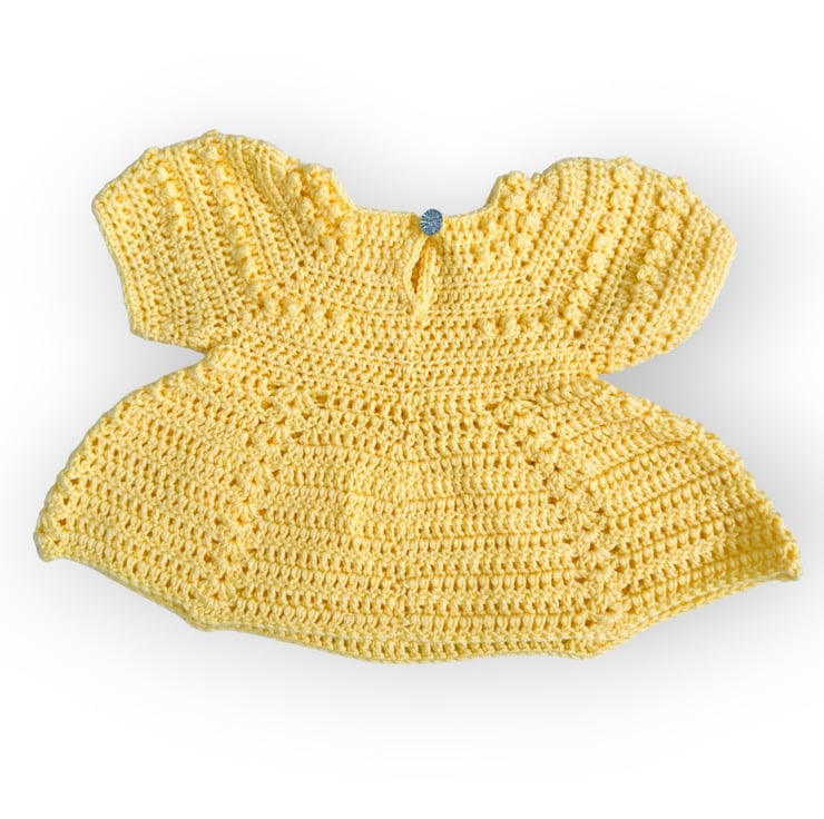 Bright and cheerful, this baby girls’ short-sleeved crochet dress in sunshine yellow is perfect for playtime, outings, or napping.