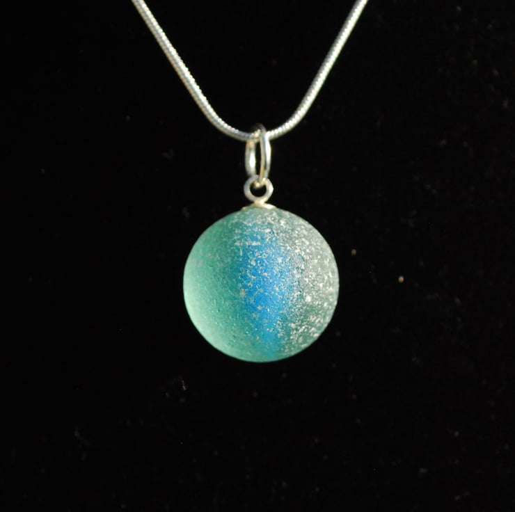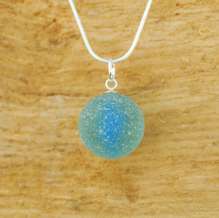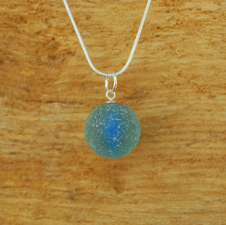 Coloured sea glass marbles are extremely rare, and this is the only blue one we have made into a pendant. It's the kind of coloured marble used as toys, which would explain its rarity - nobody would normally throw such a marble away! To show the simple beauty of the marble we have mounted it using a sterling silver peg. This is a very unusual and truly amazing pendant.