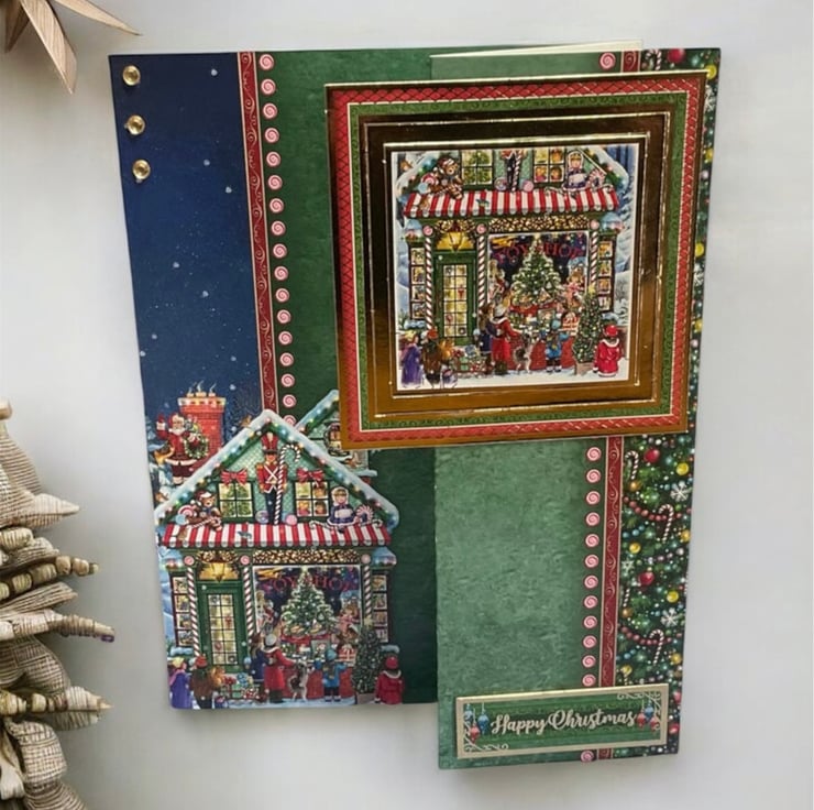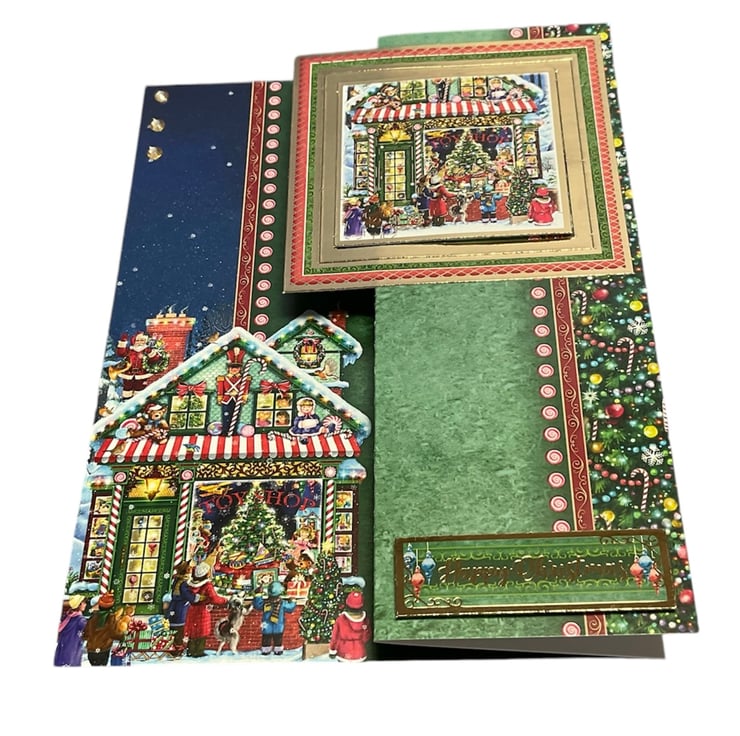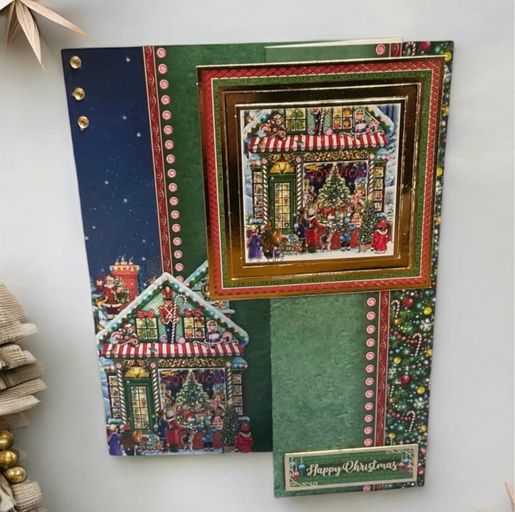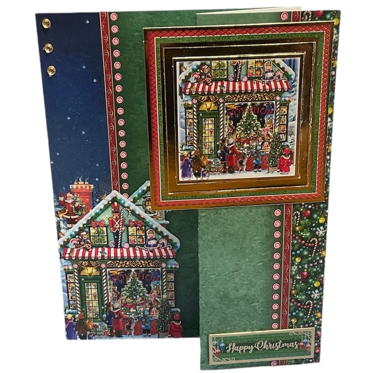 A gorgeous luxury card in deep reds, greens and blues has a Christmas toy shop filled with festive joy. The card has gold foiled luxury toppers, one with the words Happy Christmas.