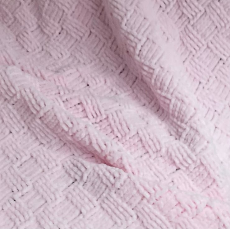 Pink chenille baby blanket, hand knitted in a super soft polyester flutterby chunky yarn.