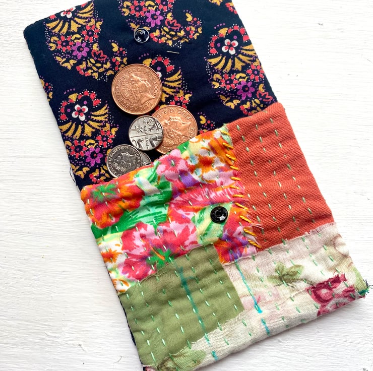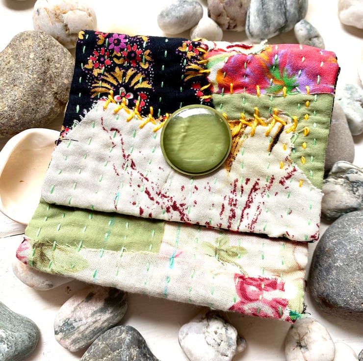 Made from pre loved fabrics and hand stitched this little purse measures 4.25x4.25.