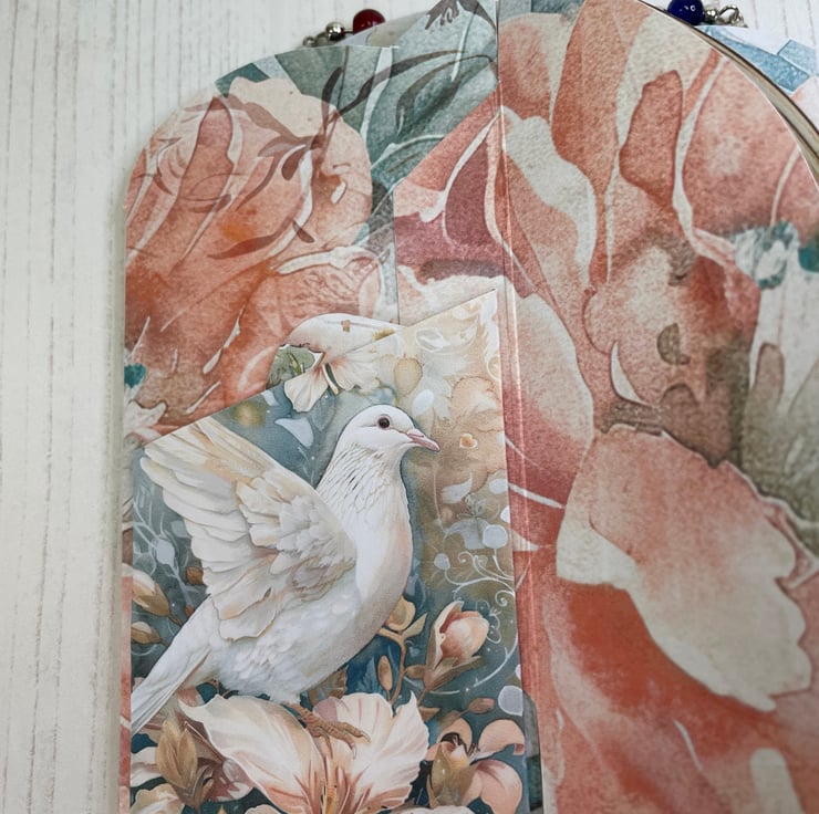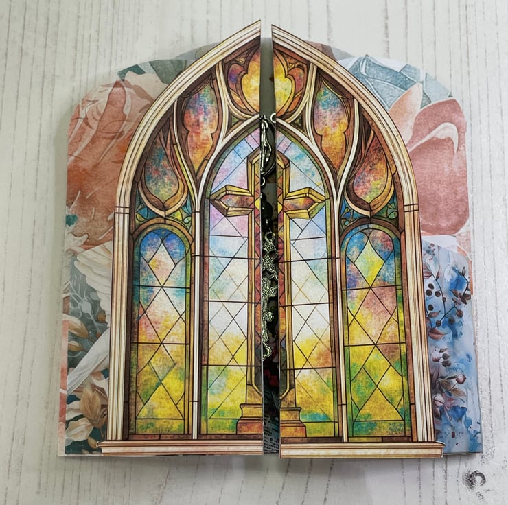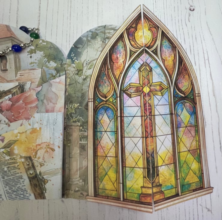 The front flaps form an image of a stained glass window. Open the folio to reveal a centre pocket with mini tags and a multicoloured glass bead rosary. under the front flaps are pockets with tags and a centre back pocket with more tags. Comes with a small organza bag for storage.