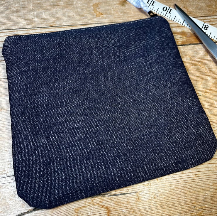 This little pouch measures approximately 18cm square. A strip of leather is attached to the zip pull.