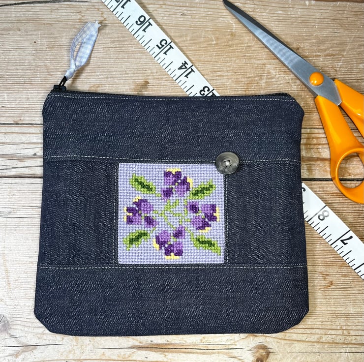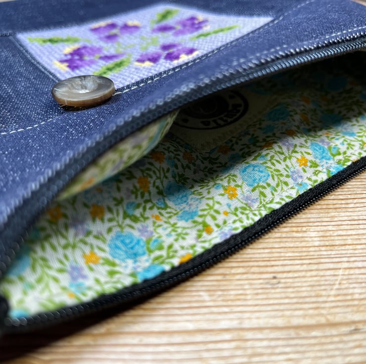 One of a kind small zip pouch with a viola pattern tapestry panel surrounded by lightweight denim fabric. The pouch is lined with vintage ditsy floral polycotton.