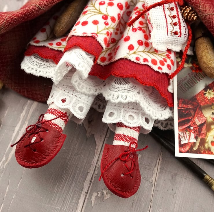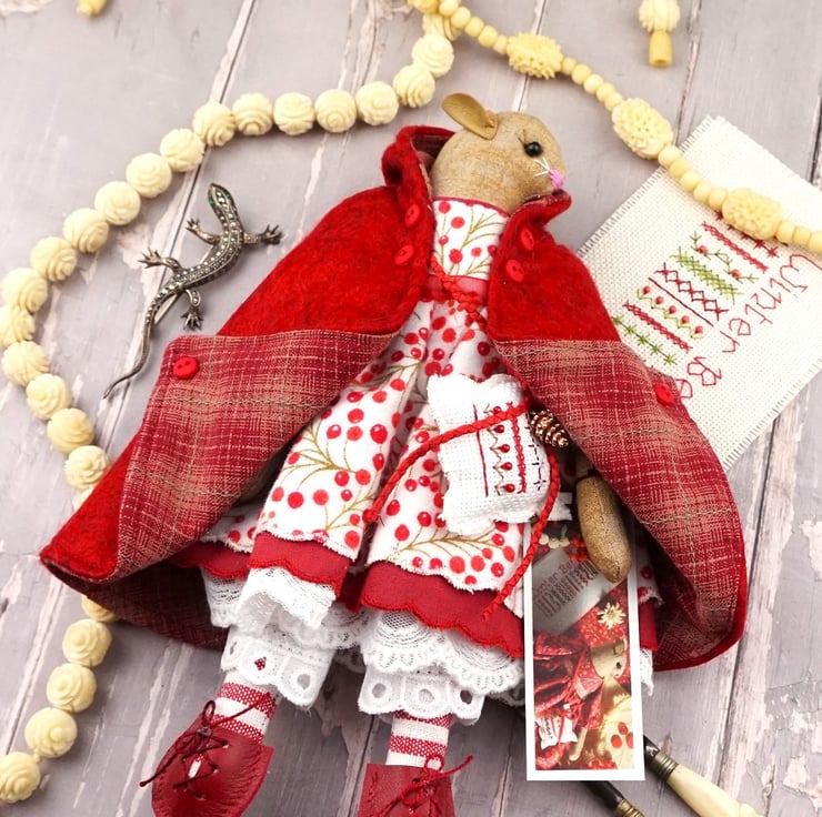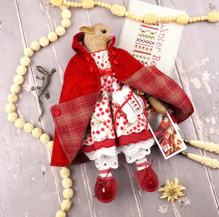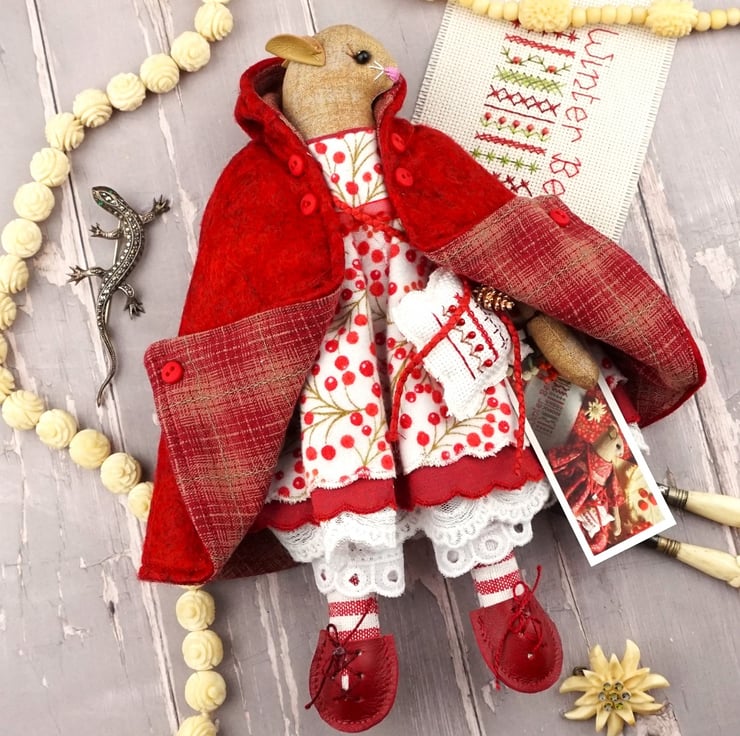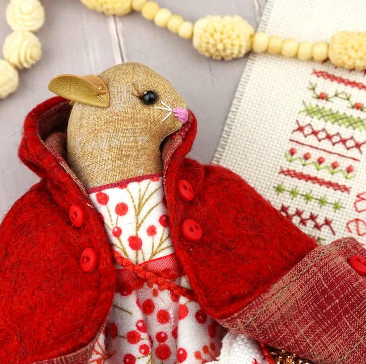This is Myrtle, a tiny winter berry Christmas mouse. She is a hand embroidered mouse with little leather ears and tail. She is dressed in a Winter Berry cotton flannel print in reds on an ivory ground with white tulle mesh and cream cotton lace bloomers. Her dress is finished with organza ribbon, tiny buttons and little leather shoes. She is a brown mouse with brown ears, a pink tail, white whiskers and an embroidered pink nose.