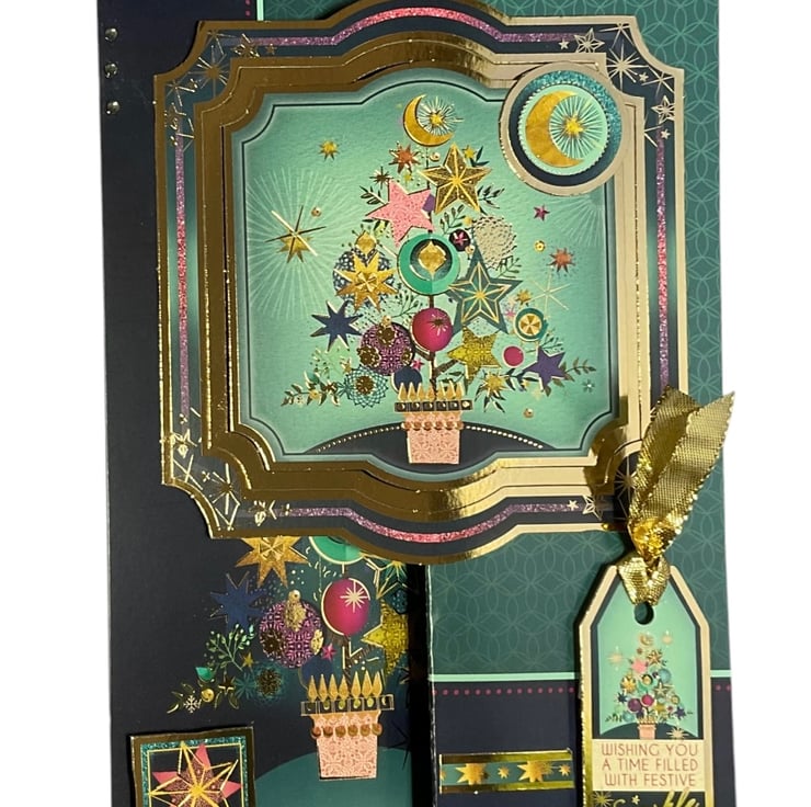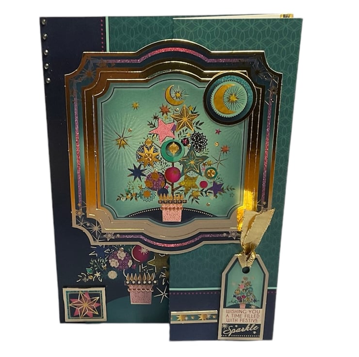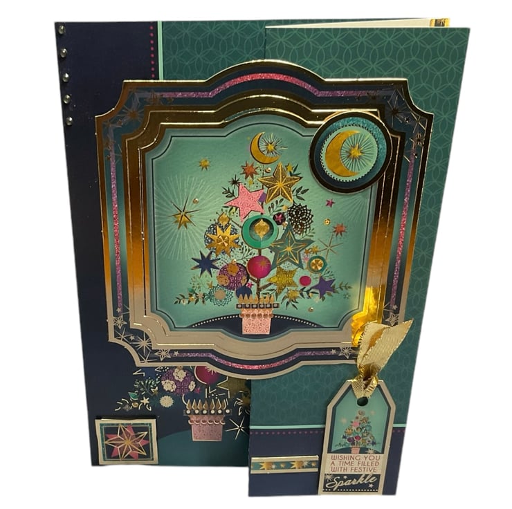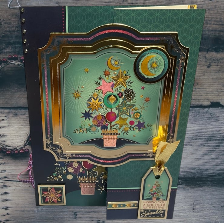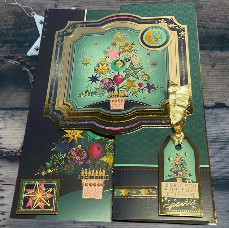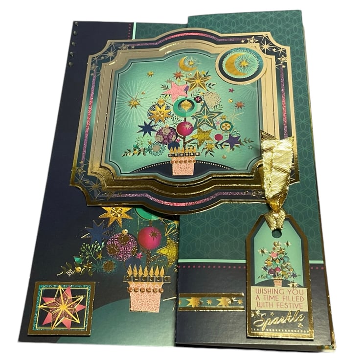This lovely zig zag card in shades of dark green and jade features a contemporary Christmas tree design with stars, moons and baubles. A large gold foiled topper has been added with a coordinating design. A topper with the words Wishing you a Time Filled with Festive Sparkle completes the card.