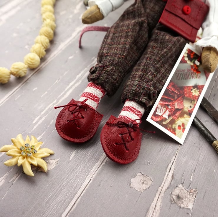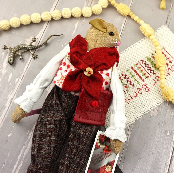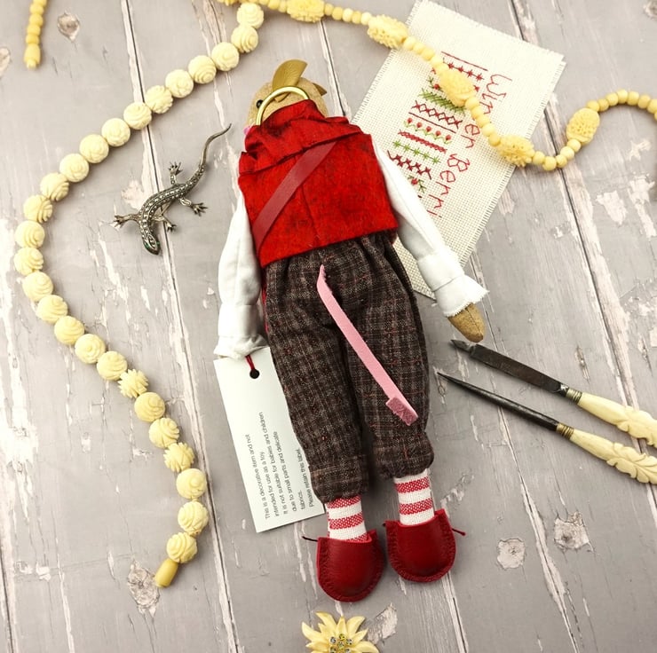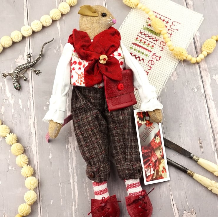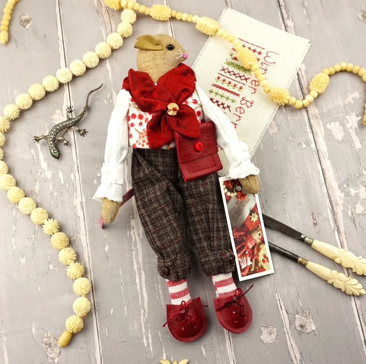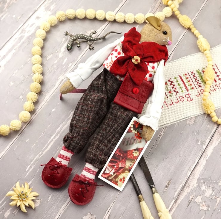 This is Arden, a tiny winter berry mouse. He is a hand embroidered mouse with little leather ears and tail. He is dressed in tweedy yarn dyed cotton plus fours with linen shirt and a Winter Berry print cotton flannel waistcoat. He is finished with tiny buttons, leather shoes and a little red leather bag.