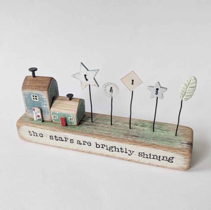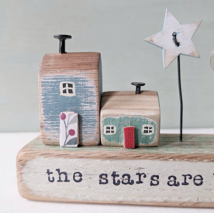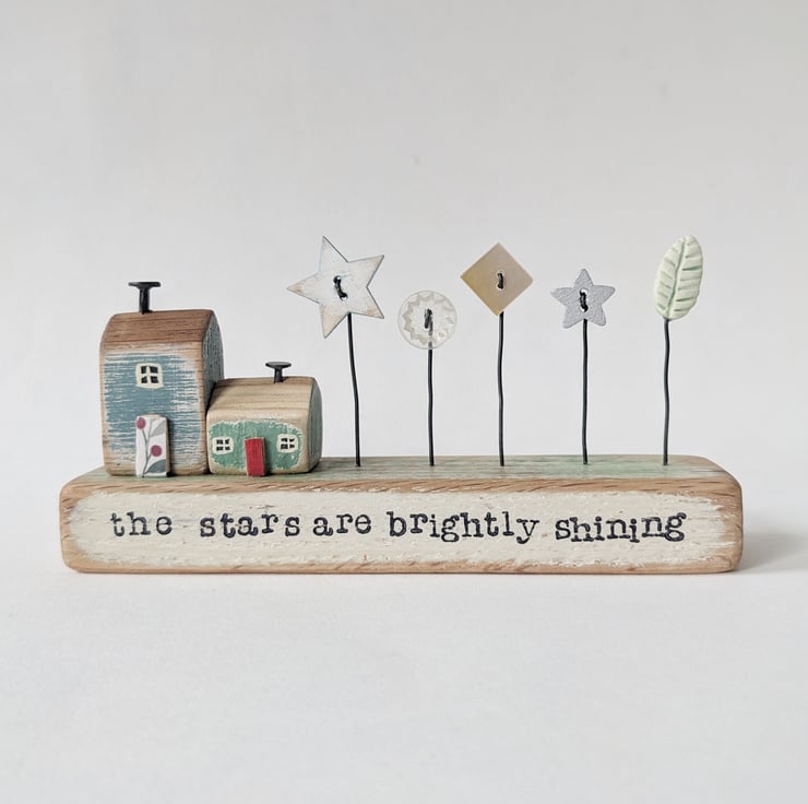 It sits on a painted and sanded block of wood, and on the front are the hand stamped words 'the stars are brightly shining'.