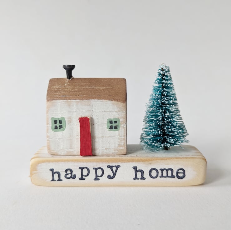 On a hand stamped wooden base, add your teeny painted house and tree.