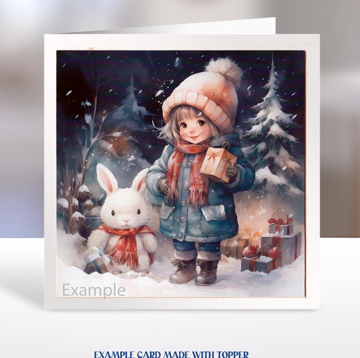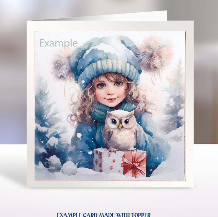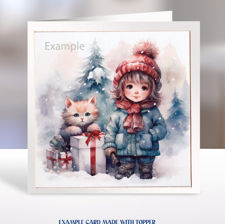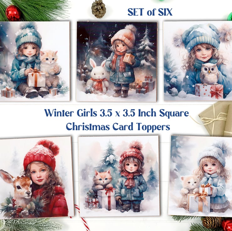 A set of six 3.5 inch square card toppers - Christmas Girls with animals and Christmas gifts.