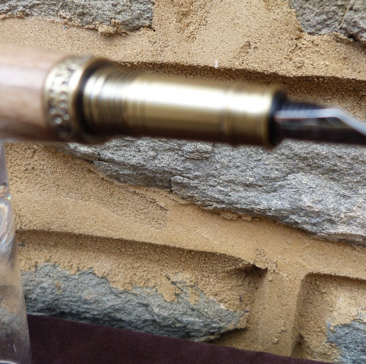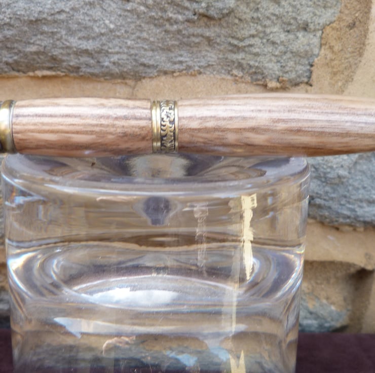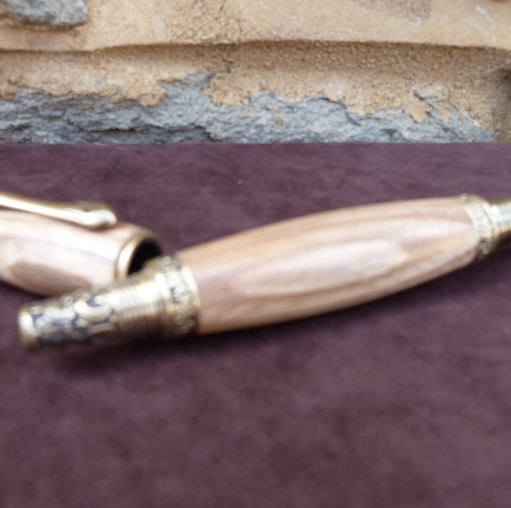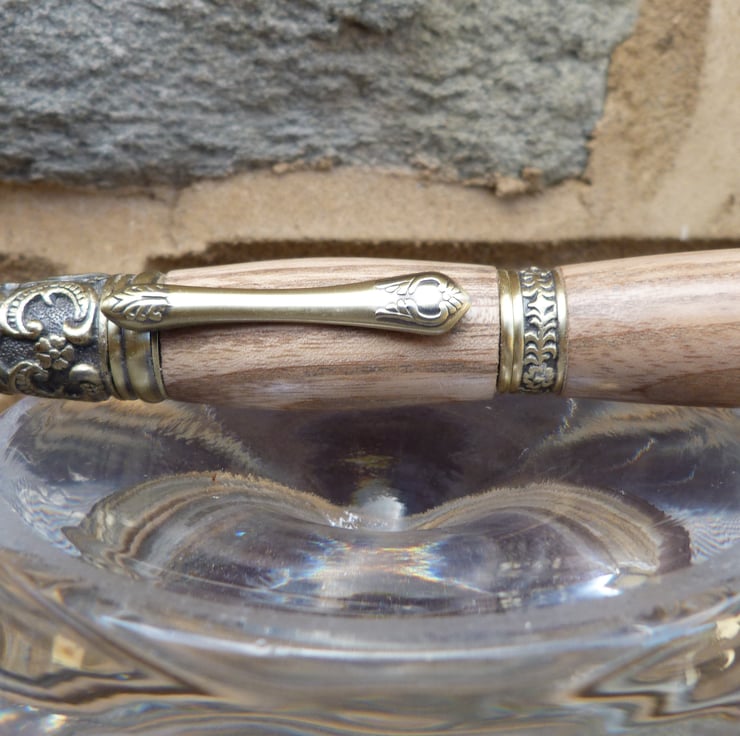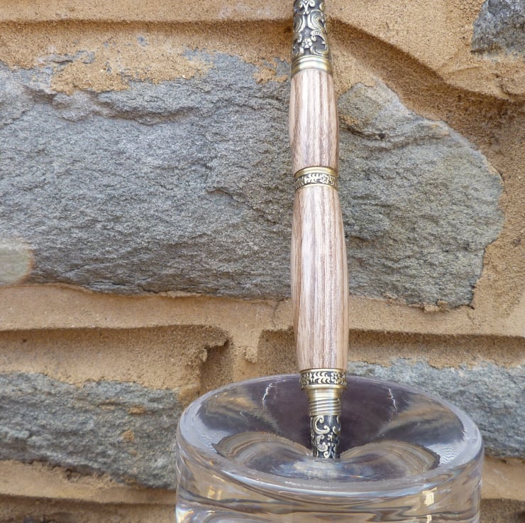 A beautiful fountain pen, very ornate and quite chunky in the hand, noticeably but not out of the way. It would make an unusual gift and a keepsake for that 'special person'. Heartwood ash is the species used.The pen is six and a quarter inches in length. As normal replacement ink cartridge and postal cost is within the price.