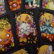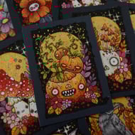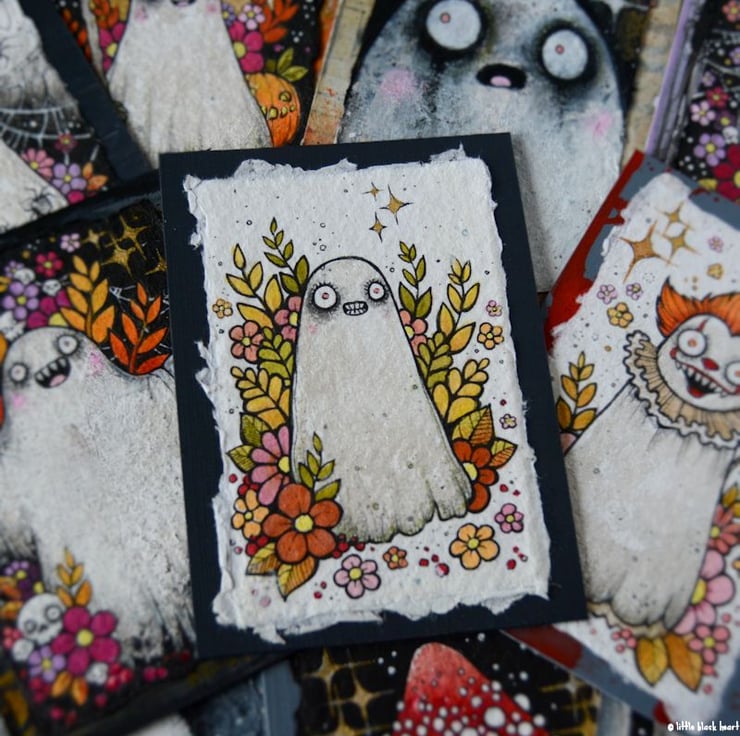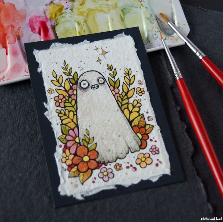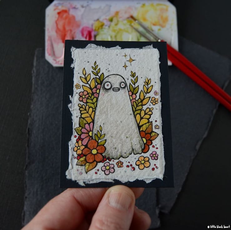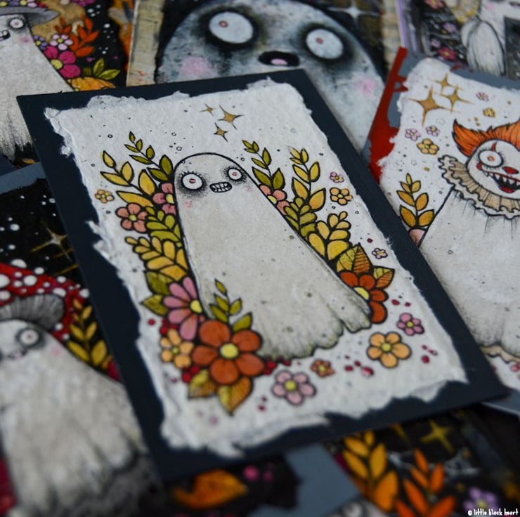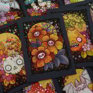 this aceo is an original artwork, hand drawn with a tiny 0.05 nibbed pen, then coloured with ink, artists pens and watercolour paints, on indian khadi paper. khadi paper is handmade from recycled cotton rag, it has a lovely textured surface and deckled edges. i have then mounted the illustration onto 300gsm cardstock, hand painted with a paynes grey to create a dark surrounding edge/background.