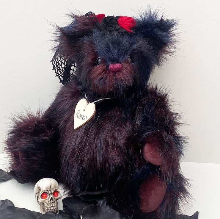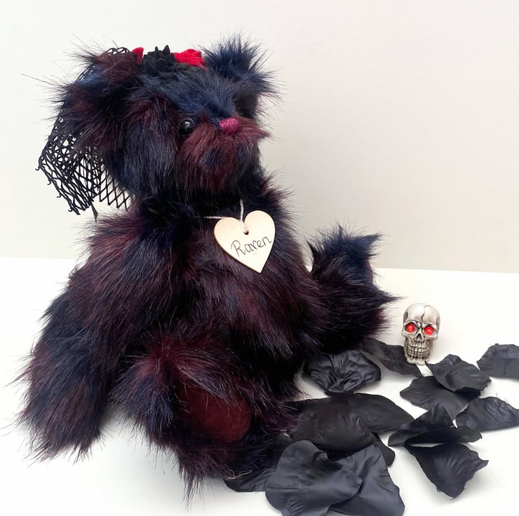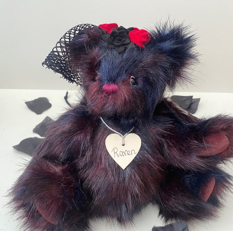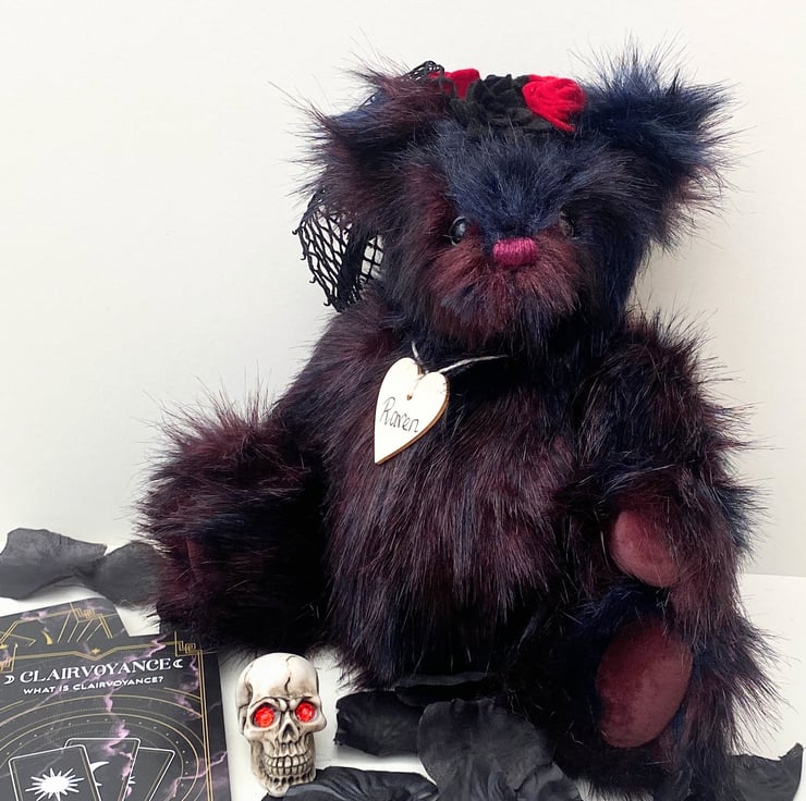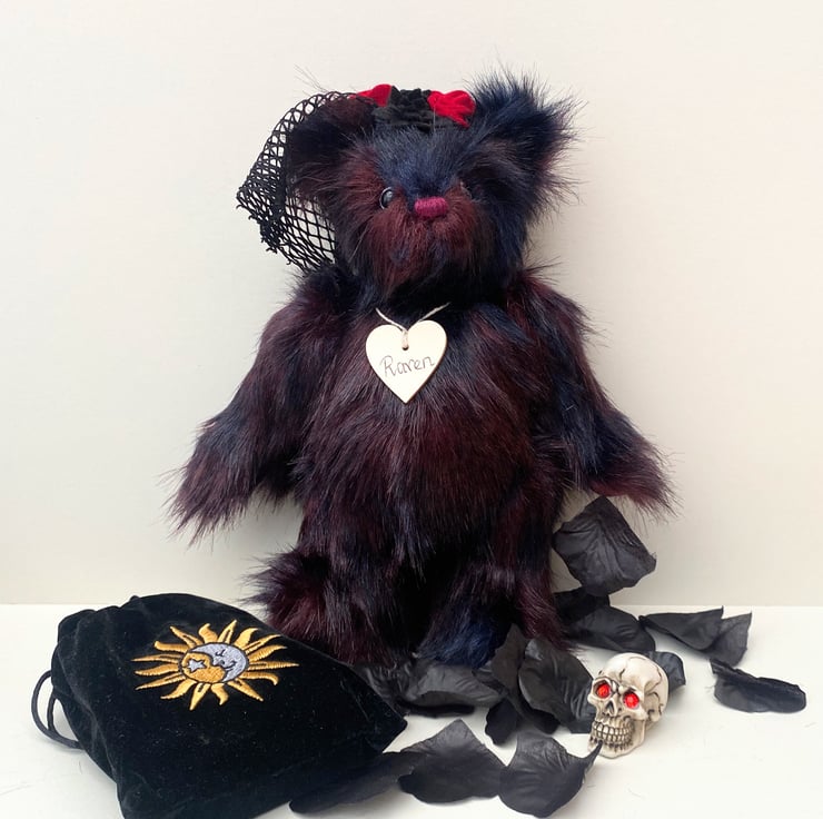 Inspired by my love of Goth, tarot and witchcraft Raven is a beautiful collectable bear who loves the darker side of life but still has a gentle loving soul and loves to give big bear hugs.