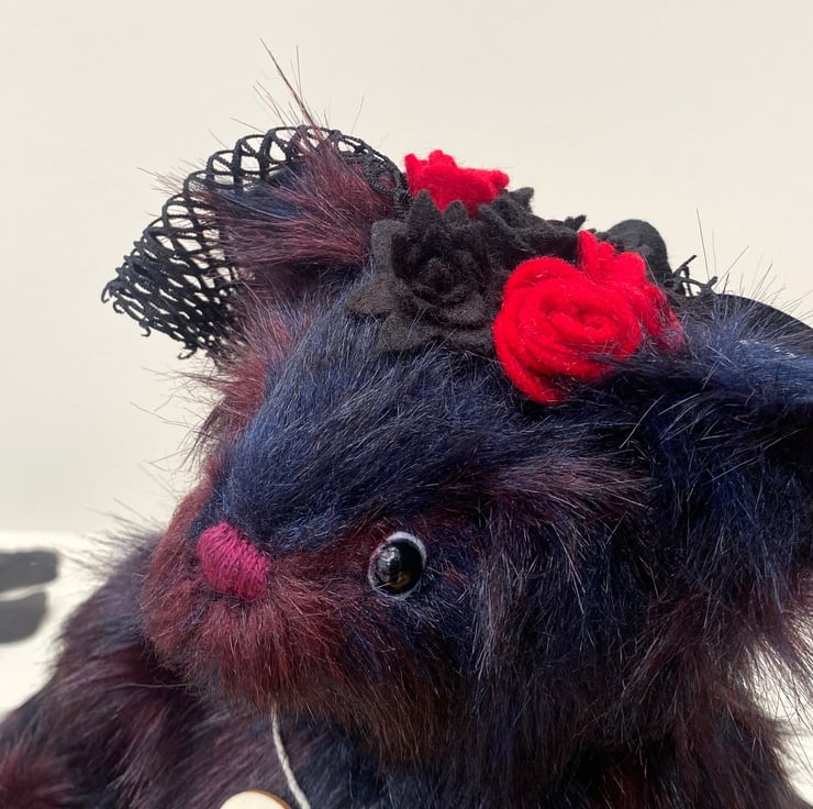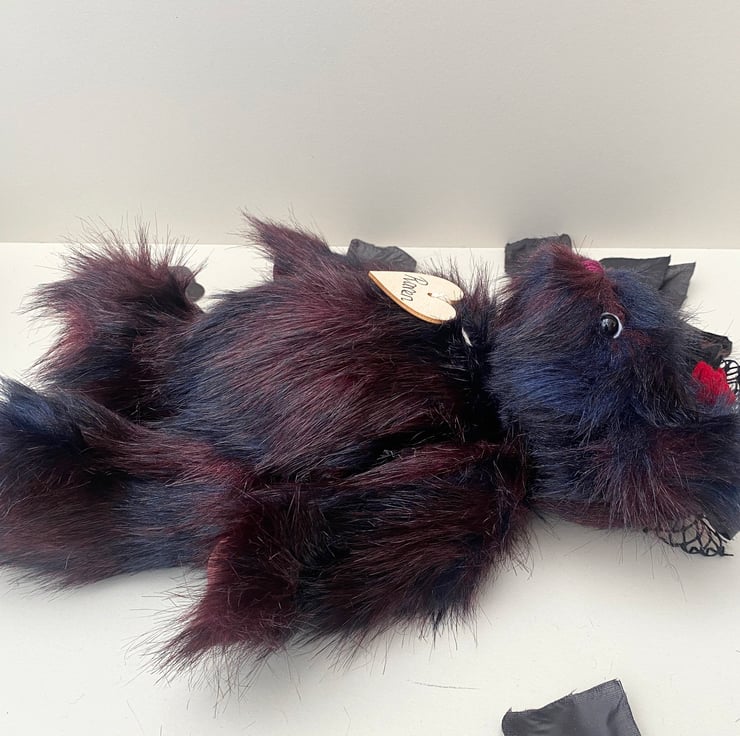 Meet Raven, a beautiful dark artist bear standing at 12" tall and handcrafted from luxury synthetic dense and long pile fur in deep colours of black, burgundy and midnight blue.