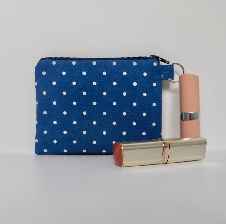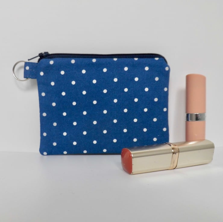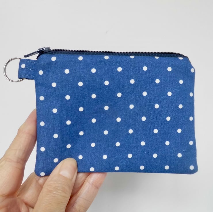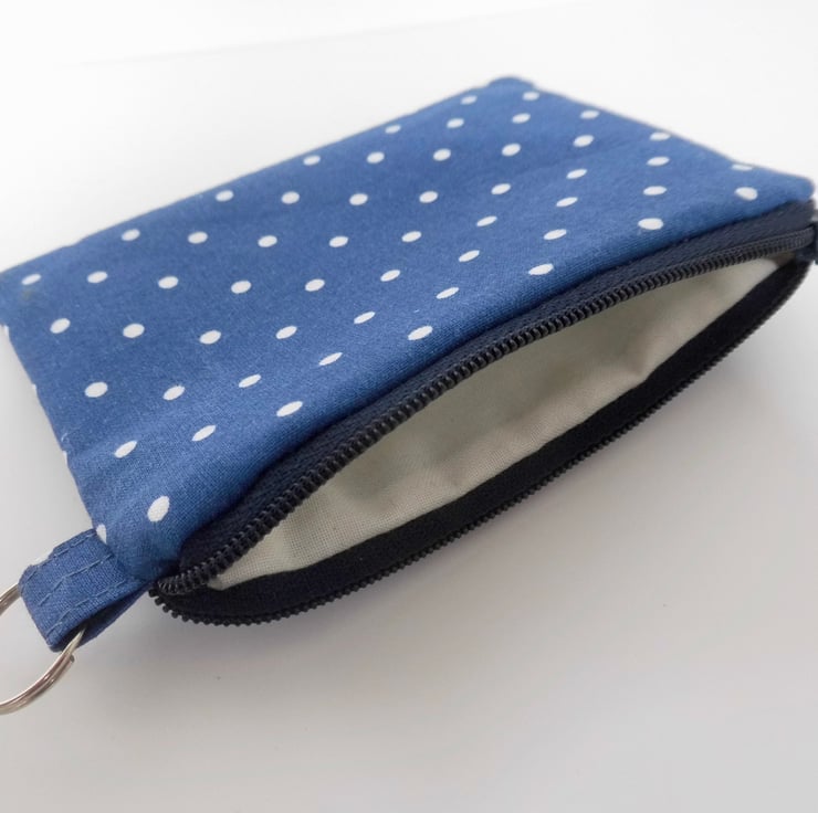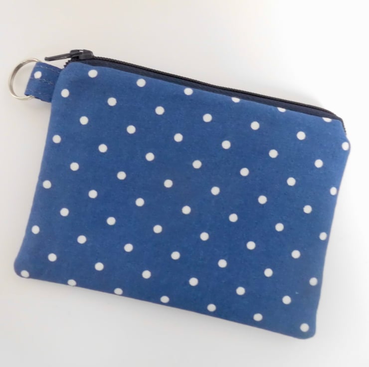 This coin purse is made using a quality quilting cotton which has a blue background with small white spots. I backed the fabric with fusible fleece for softness and body and have inserted a jump ring into one of the side seams so that it is easy to attach to your keyring or inside a bag. Lined with plain cream poly/cotton fabric.