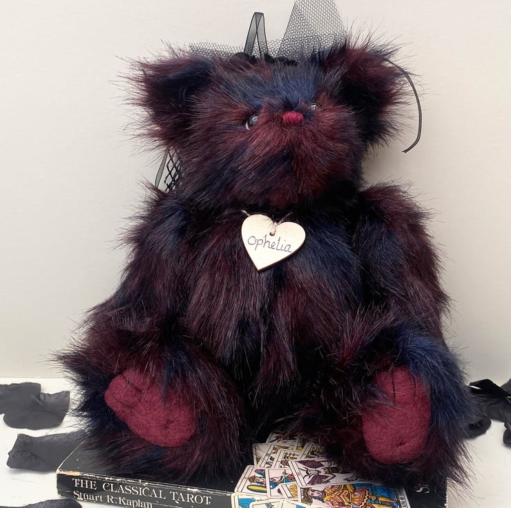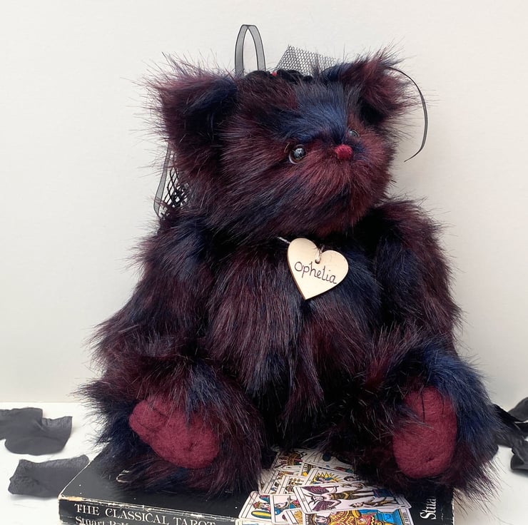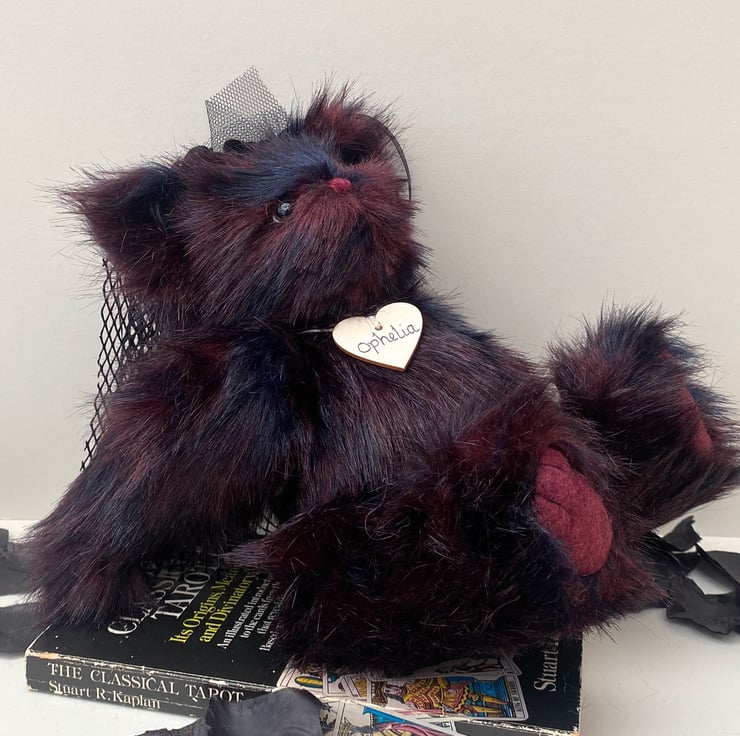 Inspired by my love of Goth, tarot and witchcraft Ophelia is a beautiful collectable bear with brown safety eyes, 5 way jointed with cotter pin fitments and she has a hand embroidered deep pink nose.