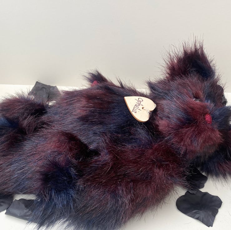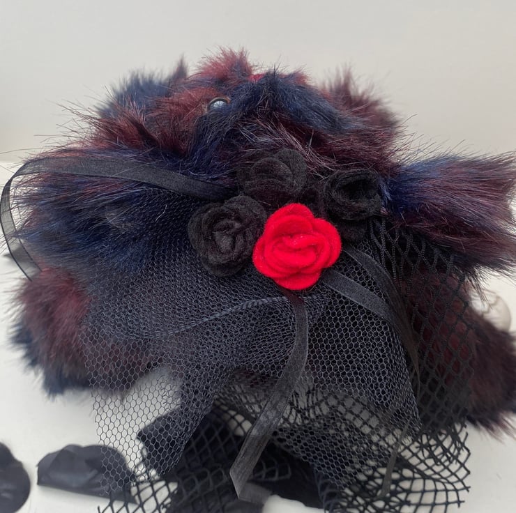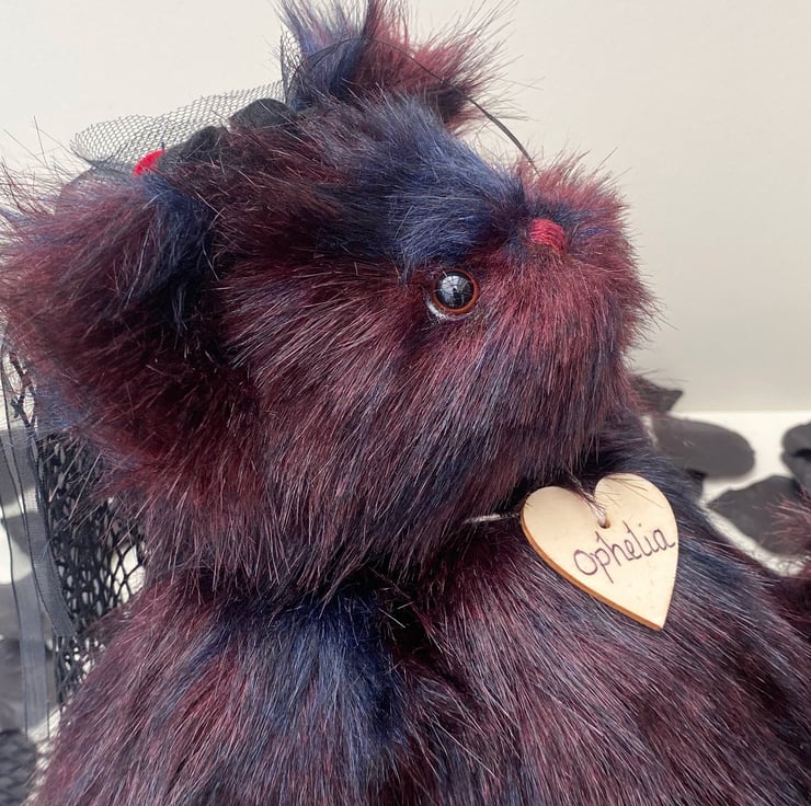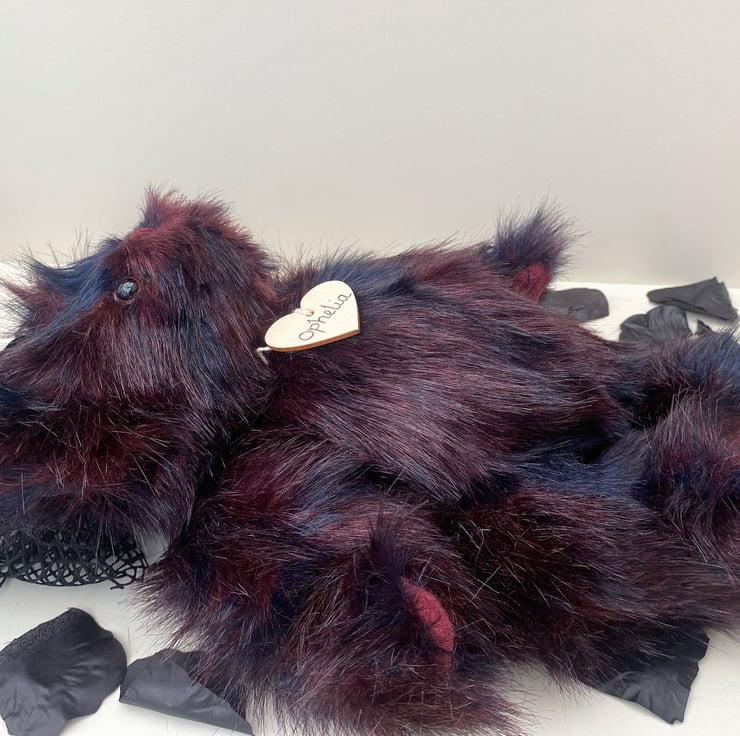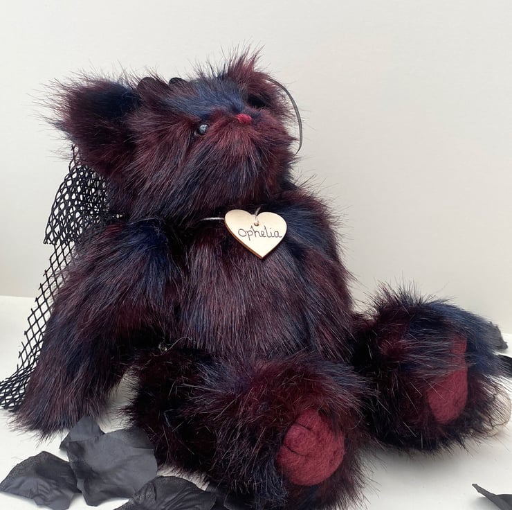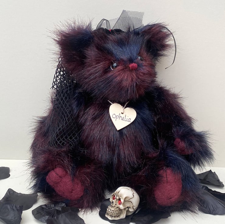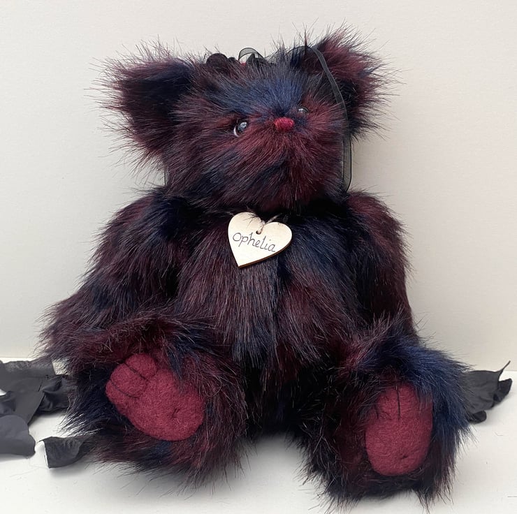 Meet Ophelia, a beautiful dark artist bear standing at 14" tall, a chubby style bear handcrafted from luxury synthetic dense and long pile fur in deep colours of black, burgundy and midnight blue.