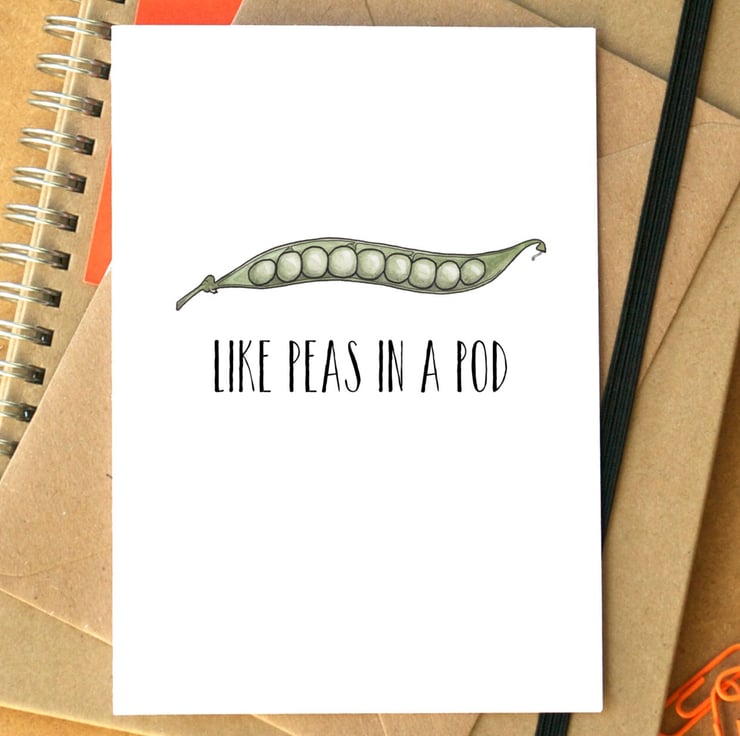 The card features my illustration of a pod of peas - which I drew by hand and then coloured with watercolour paint. The phrase "Like Peas In A Pod" accompanies the image.