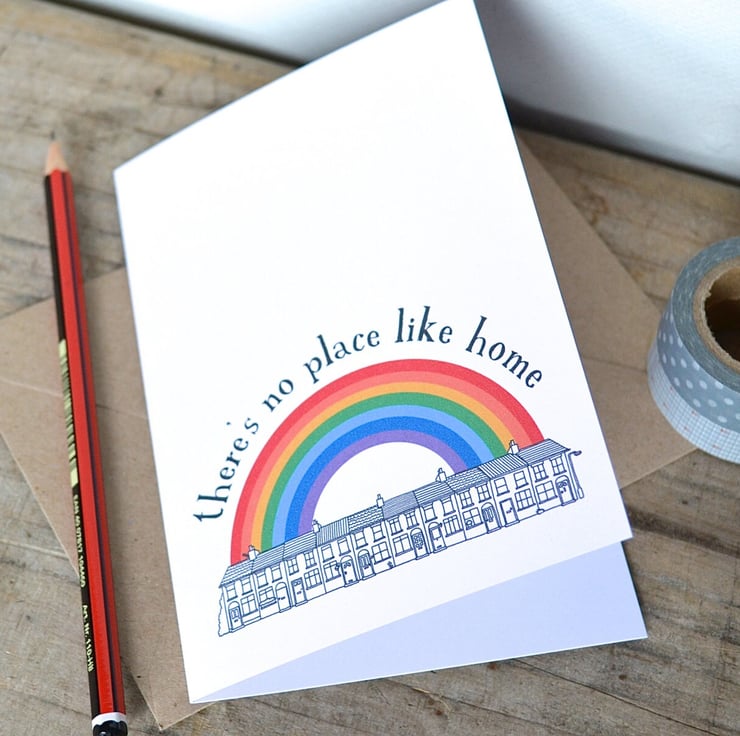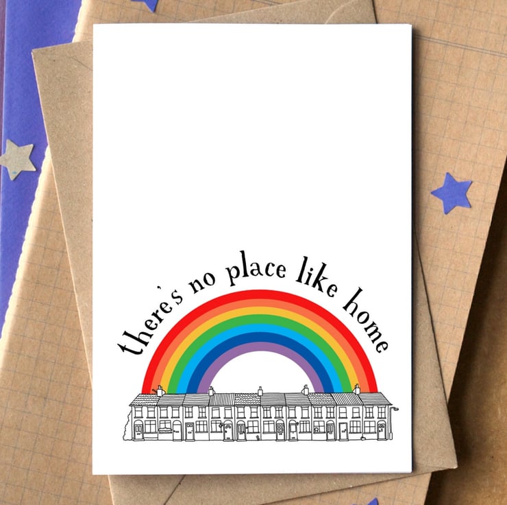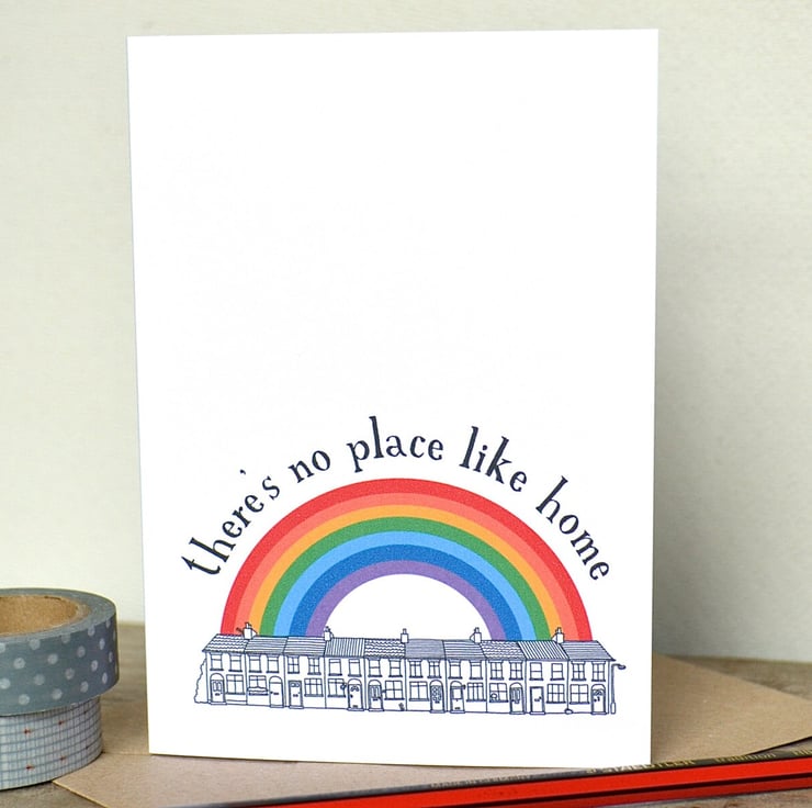 A sweet little new home card, featuring a line drawing of terraced houses and a bright and colourful rainbow.