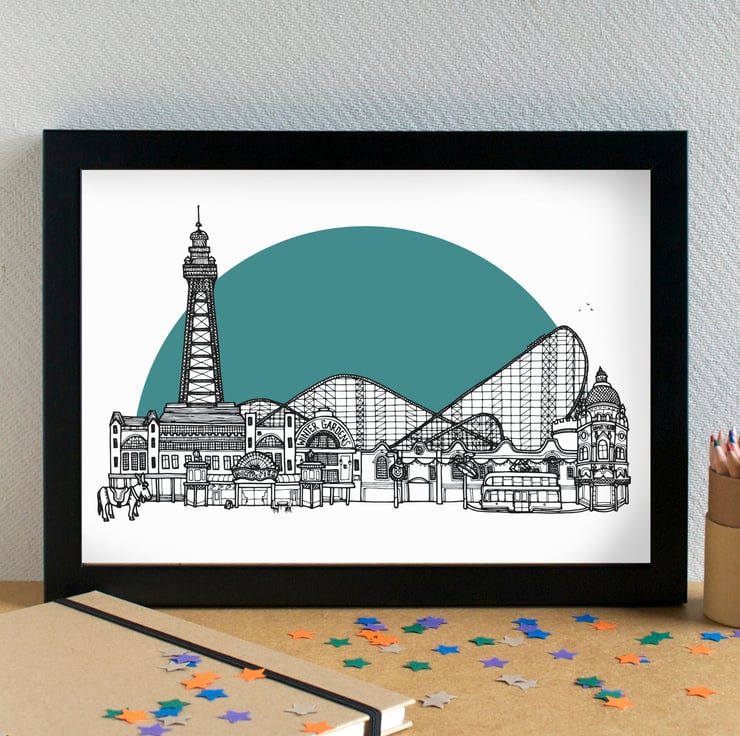 A stunning print of my illustration of the most famous contemporary landmarks in Blackpool.