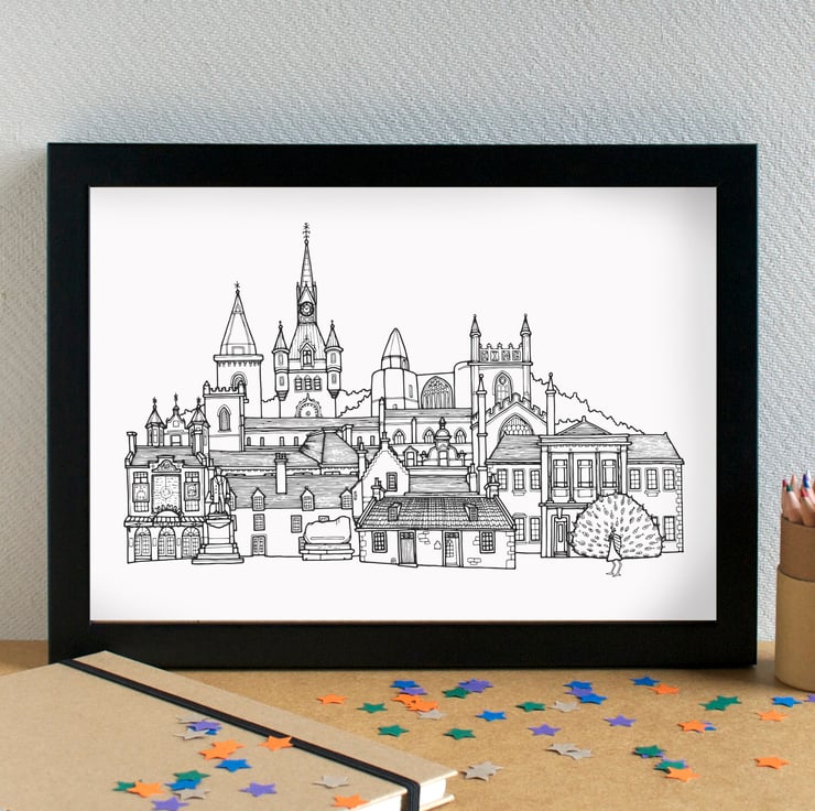 My Dunfermline illustration was drawn using pen and ink, by hand, and has then been digitally manipulated to come up with the final image. It features the Alhambra Theatre, Abbot House, the Andrew Carnegie Birthplace Museum, Carnegie Hall, Dunfermline Abbey, the palace ruins, City Chambers, Carnegie Library, Andrew Carnegie Statue and St Margaret's Stone. The image is finished off with a little peacock.