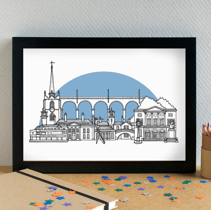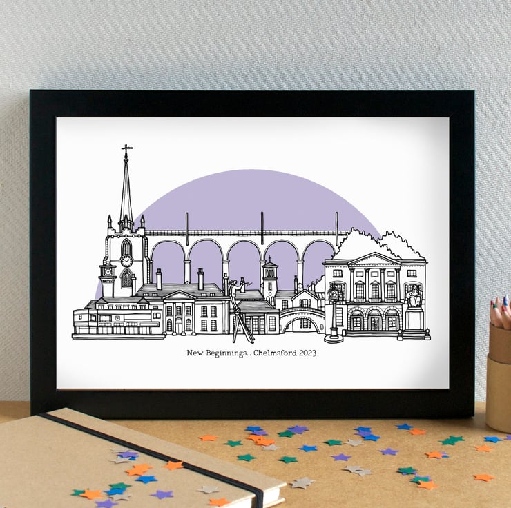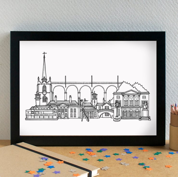 A detailed print of my illustration of the most famous landmarks in Chelmsford, Essex.