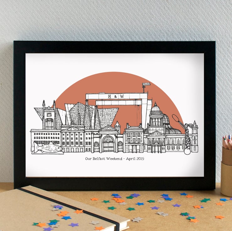 I drew the Belfast skyline using pen and ink, by hand, and then touched it up on the computer to come up with the final image. It features the Stormont, St George's Market, Queen's University, Titanic Belfast, the Crown Bar, the City Hall, the Palm House, Samson and Goliath, the Bigfish and the Beacon of Hope (aka Nuala with the Hula).