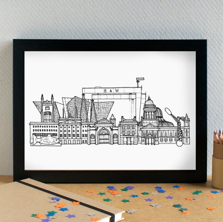 A black and white print of my striking illustration of the most famous landmarks in Belfast - with an optional splash of colour to the background.