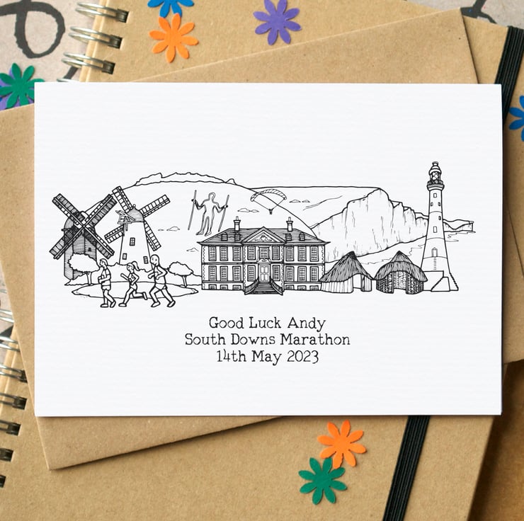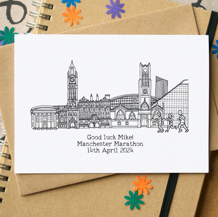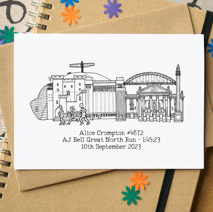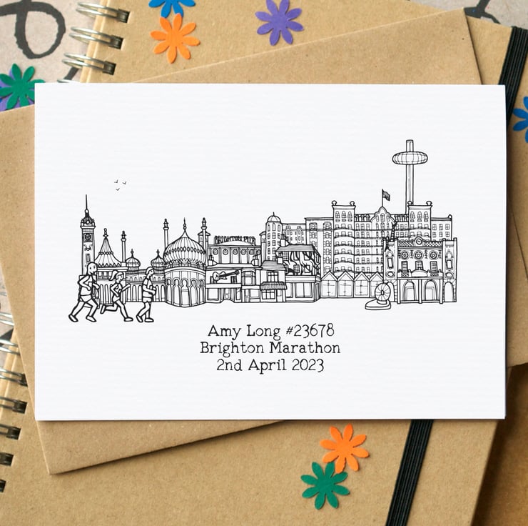 A special marathon skyline card - with your choice of town or city, three little runners, and wording underneath celebrating the athlete's achievements.