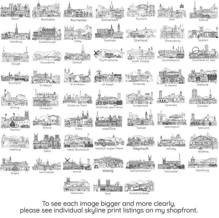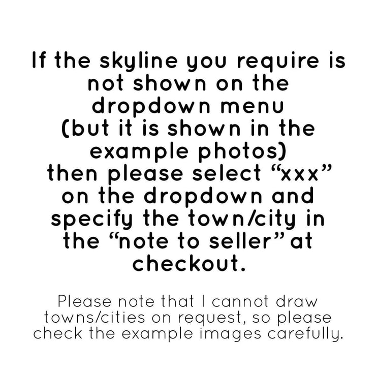 I drew each of the cityscapes myself, by hand, using pen and ink. I am in the process of expanding the range of skylines, but at present I am unable to take commissions for towns and cities which I have not yet drawn. Please check the graphics in the photos for a full list of cities (there are a few available which are not listed on the dropdown) - if you'd like one that's on the graphics but not on the dropdown please just specify this in the notes.