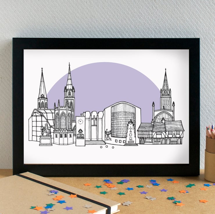 A pretty print of my hand-drawn illustration of the most famous landmarks on the Coventry skyline.