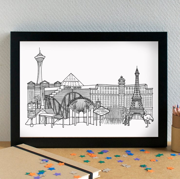 My Las Vegas illustration was drawn using pen and ink, by hand, and has then been digitally manipulated to come up with the final image. It features the Little White Chapel, MGM Grand, the New York New York roller coaster, Fremont Street, the Vegas sign, the Bellagio (including the fountains), the Eiffel Tower, the Luxor, Caesar's Palace, Stratosphere and a little flamingo.